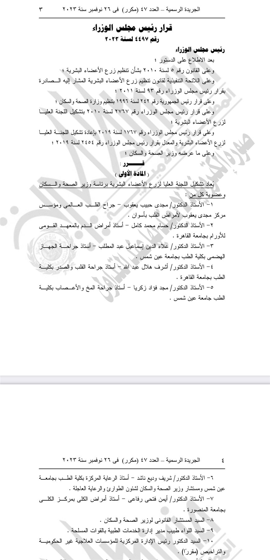 أصدر الدكتور مصطفى مدبولى، رئيس الوزراء، قرار بإعادة تشكيل اللجنة العليا لزرع الأعضاء البشرية برئاسة وزير الصحة وعضوية كل من الدكتور مجدى يعقوب ، جراح القلب العالمى والدكتور حسام محمد كامل ، أستاذ أمراض الدم بالمعهد القومى للأورام.