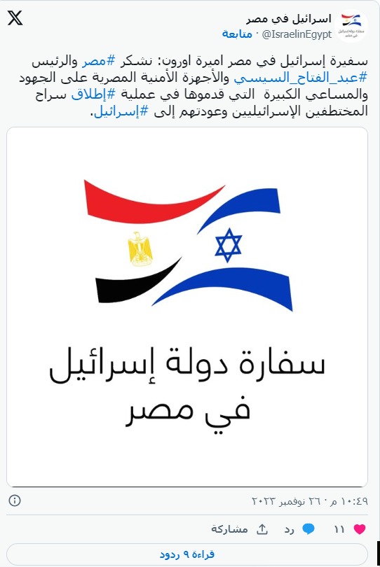وعلى صعيد آخر، وجهت السفارة الإسرائيلية في مصر رسالة إلى الرئيس المصري عبد الفتاح السيسي، بعد إطلاق سراح الأسرى الإسرائيليين لدى حماس.