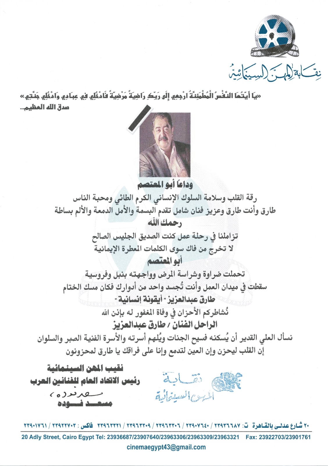 نعت نقابة المهن السينمائية برئاسة نقيب المهن التمثيلية مسعد فودة، الفنان القدير الراحل طارق عبد العزيز والذي رحل عن عالمنا مساء أمس وشيعت جنازته بعد صلاة الظهر من مسجد الشرطة بالشيخ زايد.