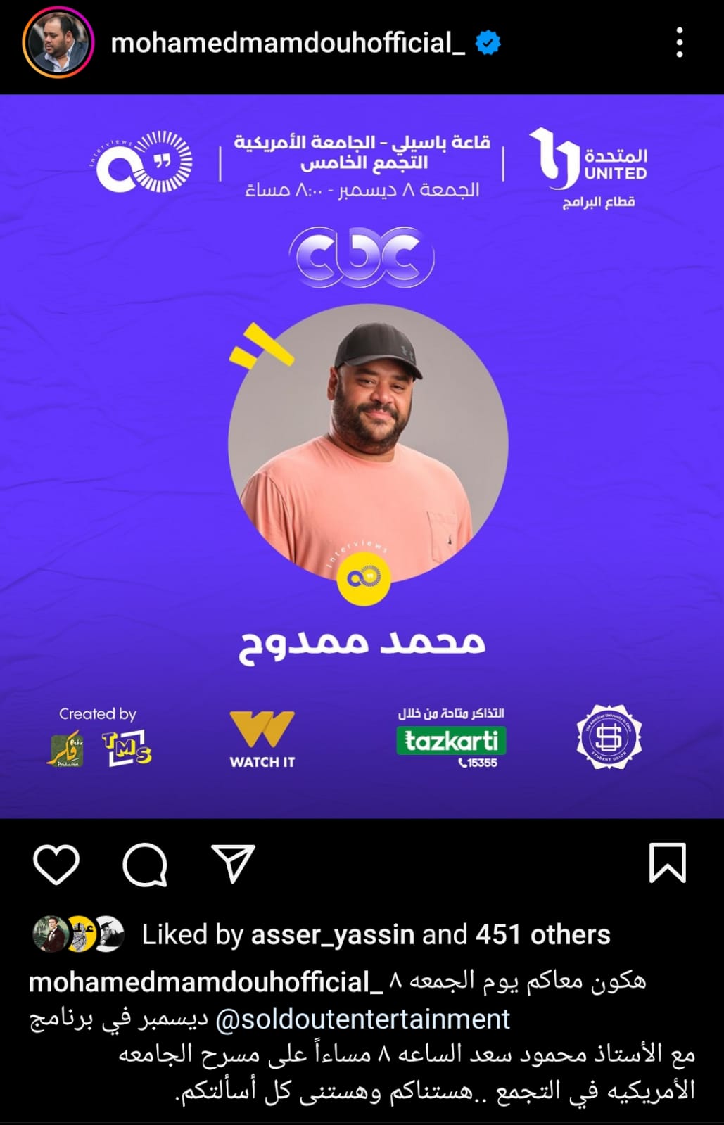 نشر محمد ممدوح صورة على صفحته الرسمية عبر موقع تبادل الصور والفيديوهات "إنستجرام" وعلق قائلا " هكون معاكم يوم الجمعة 8 ديسمبر في برنامج Soldout مع الأستاذ محمود سعد الساعة 8 مساءا على مسرح الجامعة الأمريكية في التجمع .. هستناكم وهستنى كل أسئلتكم " .