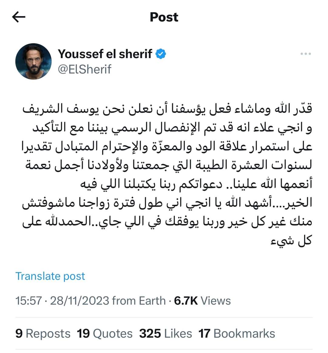 و كتبت إنجي علاء عبر منصة إكس: "قدّر الله وماشاء فعل.. يؤسفنا أن نعلن نحن إنجي علاء ويوسف الشريف أنه قد تم الإنفصال الرسمي بيننا مع التأكيد على استمرار علاقة الود والمعزّة والإحترام المتبادل تقديرا لسنوات العشرة الطيبة التي جمعتنا ولأولادنا أجمل نعمة أنعمها الله علينا".