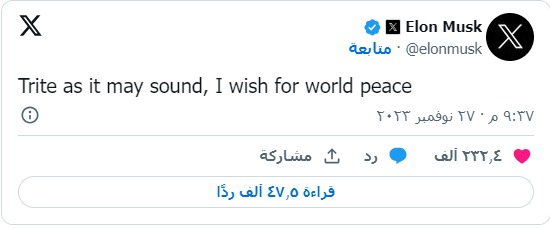 وما زاد الطين بلة، تأكيده بتغريدة على حسابه في إكس، مساء أمس أنه يتمنى أن يعم السلام حول العالم.