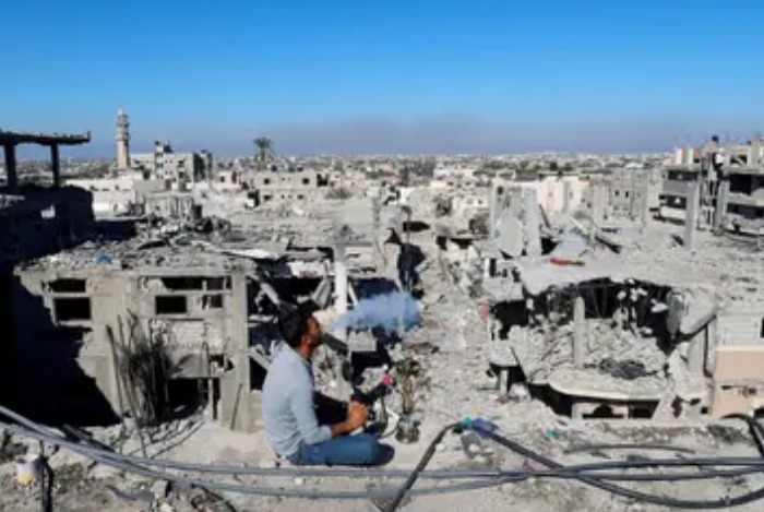 وثق مقطع فيديو شابا فلسطينيا يدعي جهاد أبوطعيمة وهو يدخن الشيشة فوق ركام منزله الذي دمره الجيش الإسرائيلي في حي أبوطعيمة بمنطقة عبسان في مدينة خان يونس جنوب قطاع غزة.