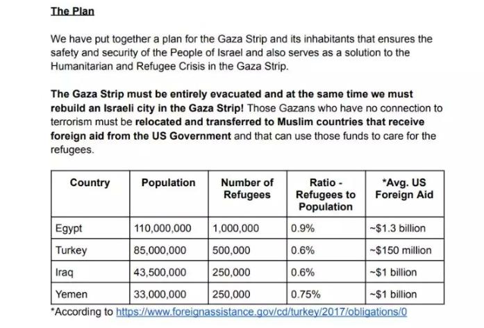 ذكرت الصحيفة ان المبادرة تدعو"إلى جعل المساعدات الأمريكية للدول العربية مشروطة بالاستعداد لقبول اللاجئين من غزة.