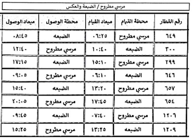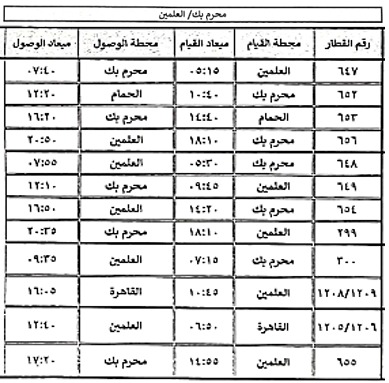 وسيتم تشغيل القطارات بين محرم بك والعلمين وبين الضبعة ومرسى مطروح طبقاً للجداول المرفقة ومع بدء الاعمال يوم 3/12/2023 يتم ايقاف تشغيل قطارى 939/940 و943/942 القاهرة مرسى مطروح والعكس وكذلك قطار 658 محرم بك /الحمام لحين نهو الاعمال بالخط .