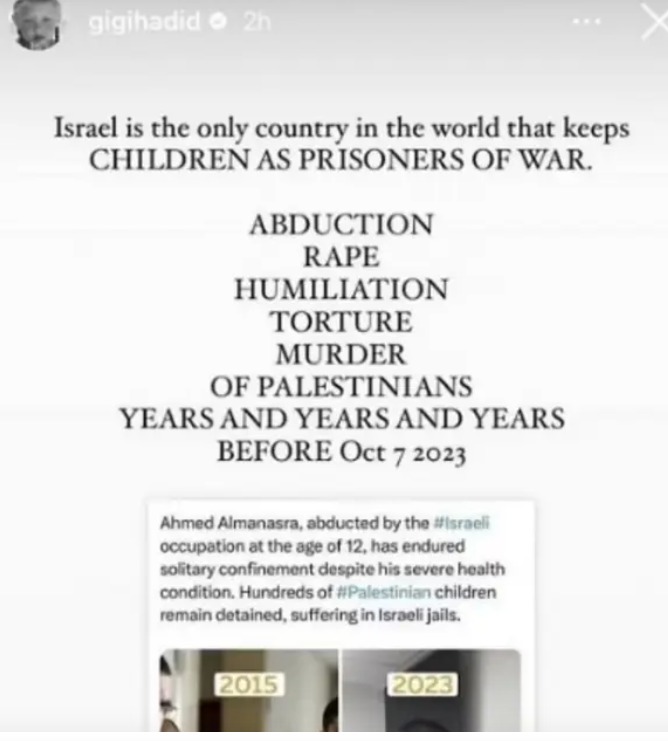 وكانت جيجي قد نشرت وعبر "ستوري إنستغرام"، صورة أحمد مناصرة وكتبت: "إسرائيل الدولة الوحيدة في العالم التي تبقي الأطفال أسرى حرب. اختطاف، واغتصاب، وإذلال، وتعذيب، وقتل فلسطينيين. سنوات وسنوات وسنوات. قبل 7 أكتوبر 2023".