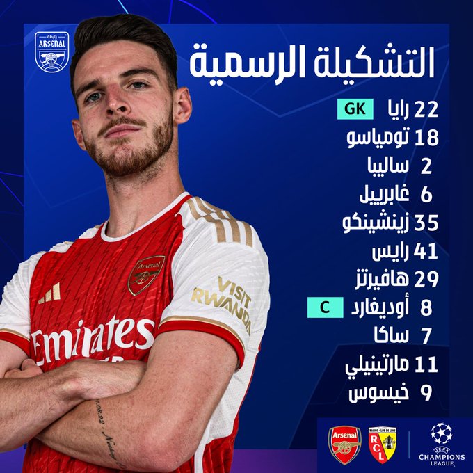 تشكيل ارسنال لمواجهة لانس في دوري أبطال أوروبا