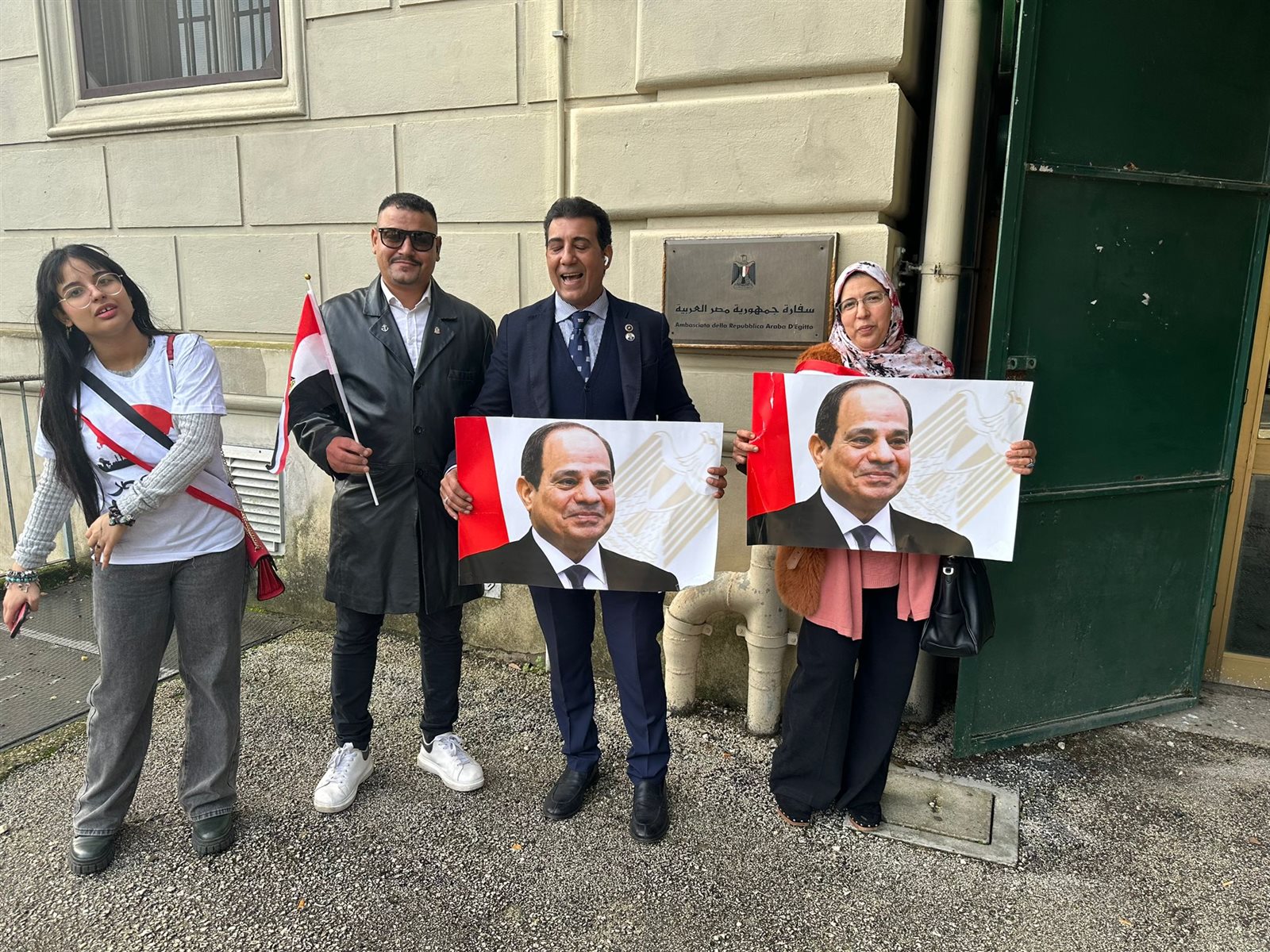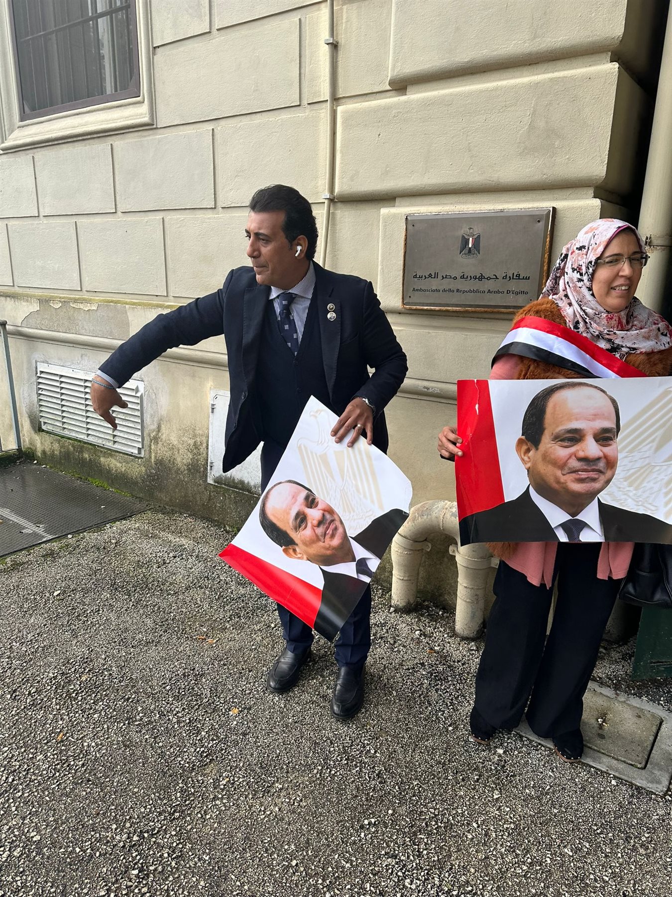 بالأعلام وصور السيسي.. احتفالات المصريين في روما بالانتخابات الرئاسية من أمام اللجان
