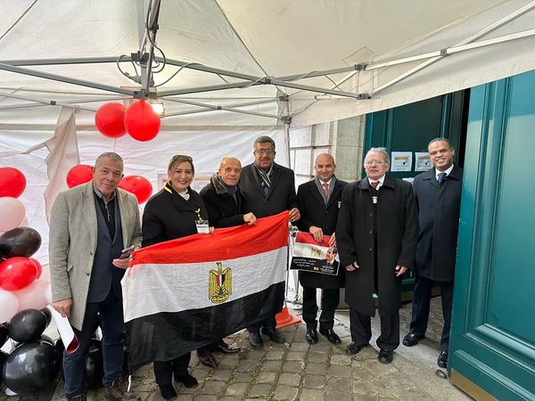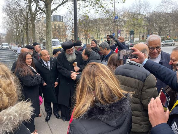 وحضر المواطنون المصريون رافعين أعلام مصر، وقاموا بالتقاط صور مع الأنبا مارك أسقف الكنيسة القبطية في باريس.