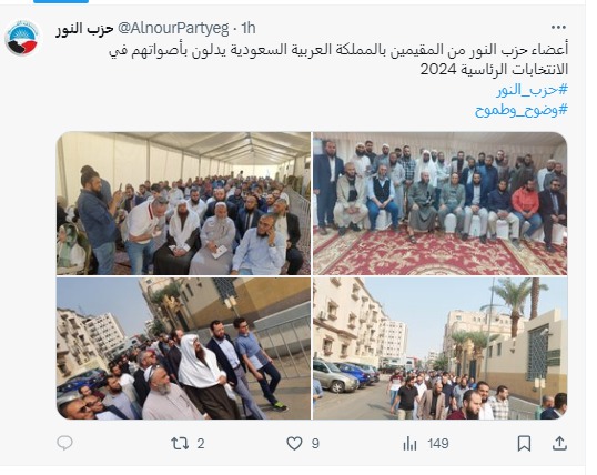 وقال الحزب على حسابه على "إكس"، مرفقًا عددًا من الصور للمشاركة: "أعضاء حزب النور من القيمين بالمملكة العربية السعودية، يدلون بأصواتهم في الانتخابات الرئاسية 2024".