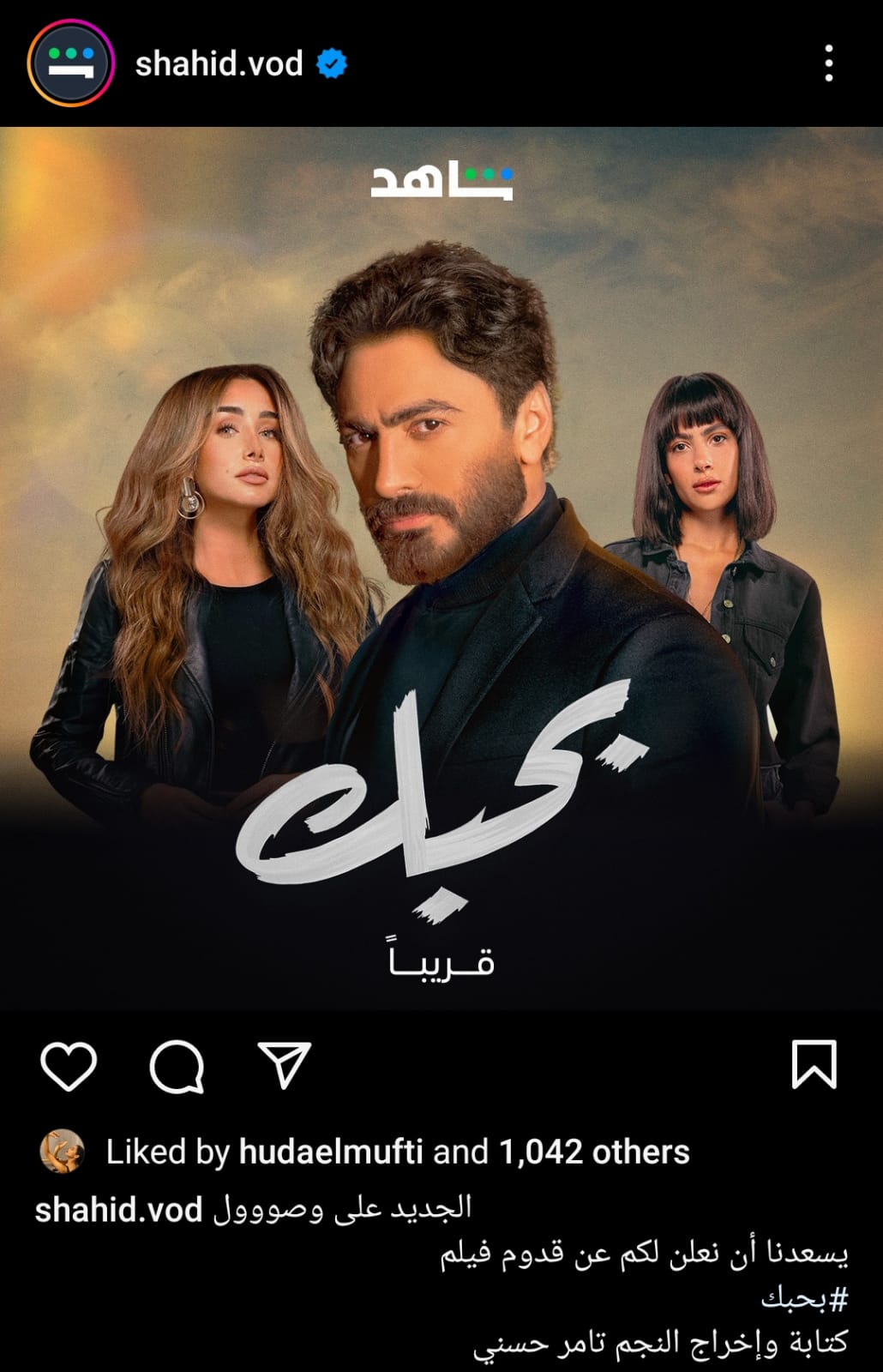 كما نشرت شاهد البوستر الرسمي للفيلم على الصفحة الرسمية عبر موقع تبادل الصور والفيديوهات " إنستجرام " وعلقت قائلة " الجديد على وصول.. يسعدنا أن نعلن لكم عن قدوم فيلم بحبك .. كتابة وإخراج النجم تامر حسني ".