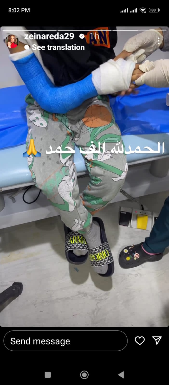أعلنت الفنانة زينة، عن إصابة أحد طفليها بكسر في ذراعه اليمين، وذلك خلا نشرها صورة له، عبر خاصية "ستوري"، على صفحتها الرسمية بموقع تبادل الصور والفيديوهات "إنستجرام ".