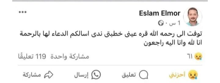 وكتب إسلام خطيب الفتاة: توفيت إلي رحمة الله خطيبتي ندي قرة عيني، أسائلكم الدعاء لها بالرحمة وانا لله وانا اليه راجعون، وذلك في منشور عبر صفحته الرسمية فيس بوك.