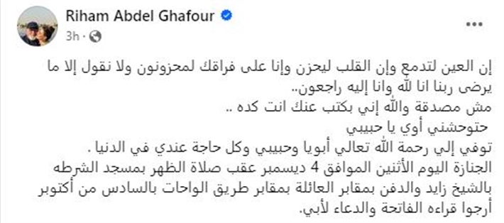وكتبت ريهام عبد الغفور عبر حسابها على فيس بوك: "إن العين لتدمع وإن القلب ليحزن وإنا على فراقك لمحزونون ولا نقول إلا ما يرضى ربنا انا لله وانا إليه راجعون..مش مصدقة والله إني بكتب عنك أنت كده .. حتوحشني أوي يا حبيبي".