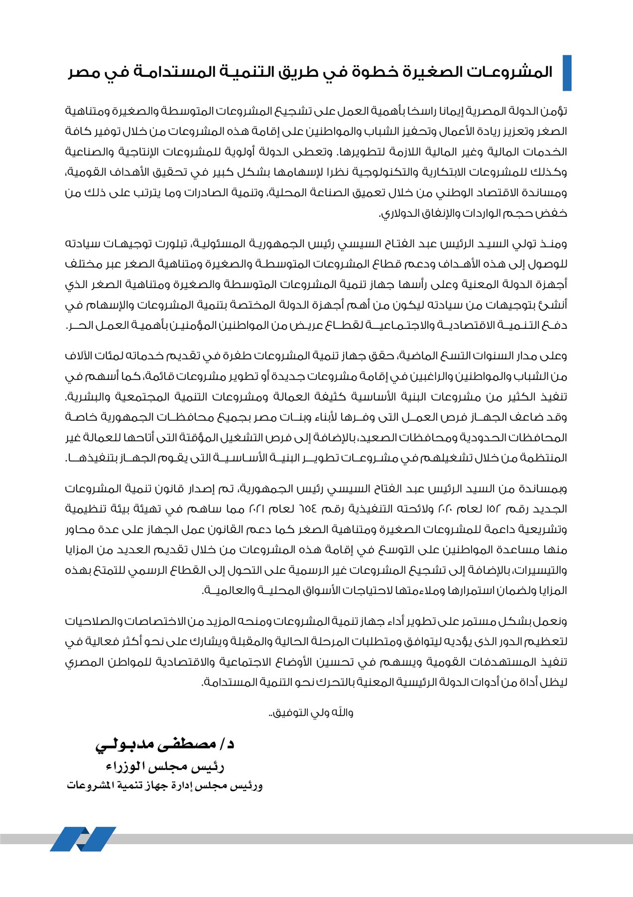 أصدر جهاز تنمية المشروعات المتوسطة والصغيرة ومتناهية الصغر تقريرا متكاملا بعنوان "الجمهورية الجديدة ... سنوات من التحديات والإنجازات" رصد فيه حجم أعماله وتطورها خلال فترة تولي السيد الرئيس عبد الفتاح السيسي رئيس الجمهورية المسئولية حيث شارك الجهاز في العديد من المبادرات الرئاسية والقومية الهامة وأشار الجهاز في تقرير صادر عنه ، أن جهاز تنمية المشروعات ساهم في تنمية وتطوير محافظات الصعيد وذلك تنفيذا لتوجيهات الرئيس عبد الفتاح السيسي بتنفيذ المشروعات الاستراتيجية التي تهدف لتحقيق تنمية شاملة في مصر وبوجه خاص في محافظات الصعيد بهدف تحويلها إلى مناطق جاذبة للاستثمار تدعم الاقتصاد الوطني وتوفر الملايين من فرص العمل للشباب وتعمل على تحسين مستوياتهم المعيشية.