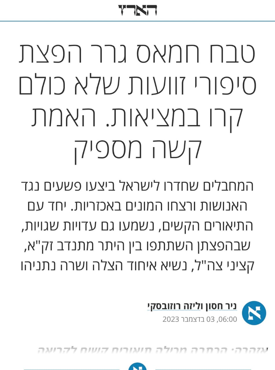 ذكرت صحيفة "هآرتس " العبرية في تحقيق لها كذب روايات الجنود والمسعفين عن ما سمي ب" مذابح " السابع من أكتوبر