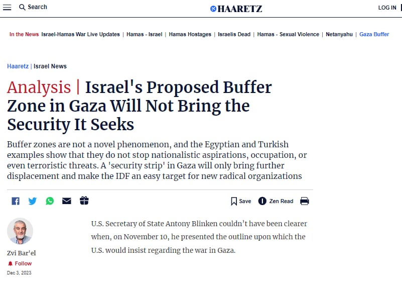 نشرت صحيفة هآرتس الاسرائيلية تحليلًا يستعرض عدم جدوى إنشاء إسرائيل لمنطقة أمنية عازلة، وذلك حسب ما توضحه التجارب المماثلة. .