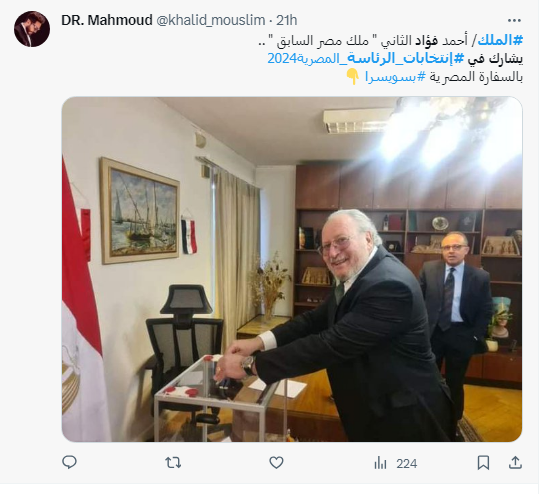 شارك، مستخدمى مواقع التواصل الإجتماعى،منصة "x" تويتر سابقاً، صورة ظهر فيها الملك أحمد فؤاد الثانى، ملك مصر السابق يشارك فى الإستحقاق الدستورى، بالإنتخابات الرئاسية لمصر عام 2024.