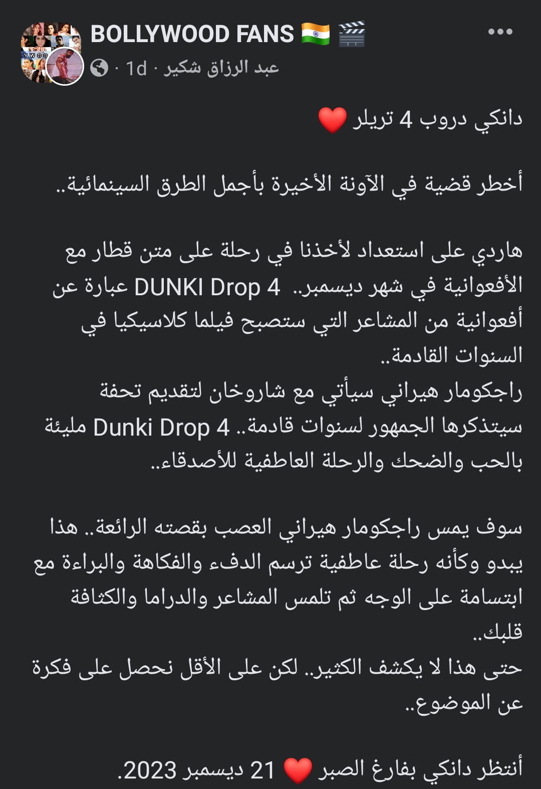جدير بالذكر أن المخرج راجكومار هيراني قد كشف في تصريحات تليفزيونية أدلى بها في وقت سابق " أن الناس حاليا منبهرون بأداء شاروخان في فيلم Jawan، ولكن عندما يشاهدون أدائه في رائعة Dunki سيغمى عليهم " .