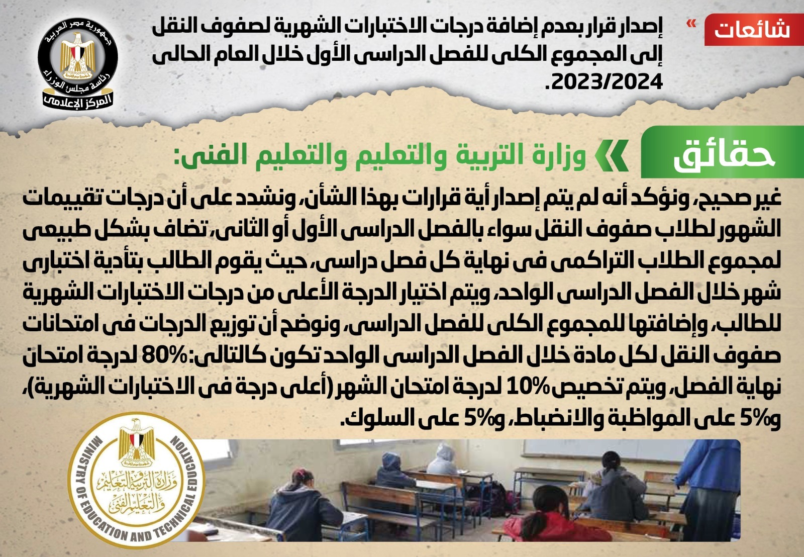 وقد قام المركز الإعلامي لمجلس الوزراء بالتواصل مع وزارة التربية والتعليم والتعليم الفني، والتي نفت تلك الأنباء، مُؤكدةً أنه لا صحة لعدم إضافة درجات الاختبارات الشهرية لصفوف النقل إلى المجموع الكلي للفصل الدراسي الأول خلال العام الحالي 2023/2024.
