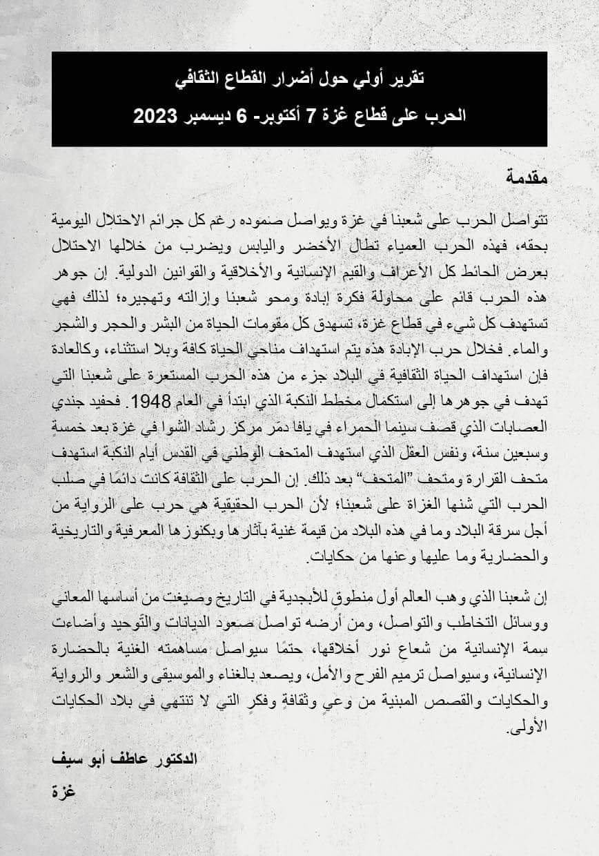 وقال وزير الثقافة الدكتور عاطف أبو سيف إن جوهر هذه الحرب قائم على فكرة محاولة إبادة ومحو شعبنا وإزالته وتهجيره؛ لذلك فهي تستهدف كل شيء في قطاع غزة، تسهدف كل مقومات الحياة من البشر والحجر والشجر والماء. فخلال حرب الإبادة هذه يتم استهداف مناحي الحياة كافة وبلا استثناء، وكالعادة فإن استهداف الحياة الثقافية في البلاد جزء من هذه الحرب المستعرة على شعبنا التي تهدف في جوهرها إلى استكمال مخطط النكبة الذي ابتدأ في العام 1948.