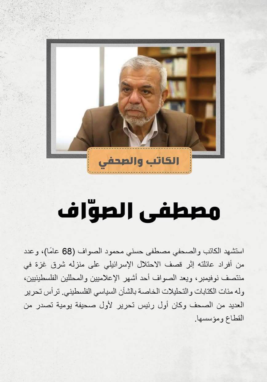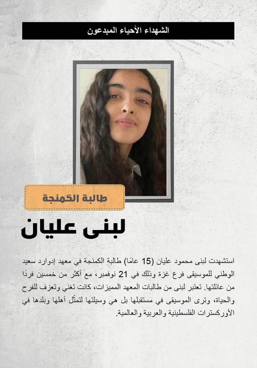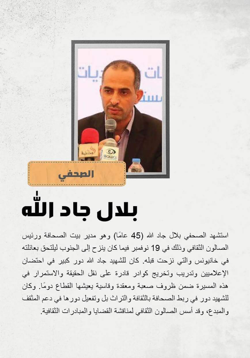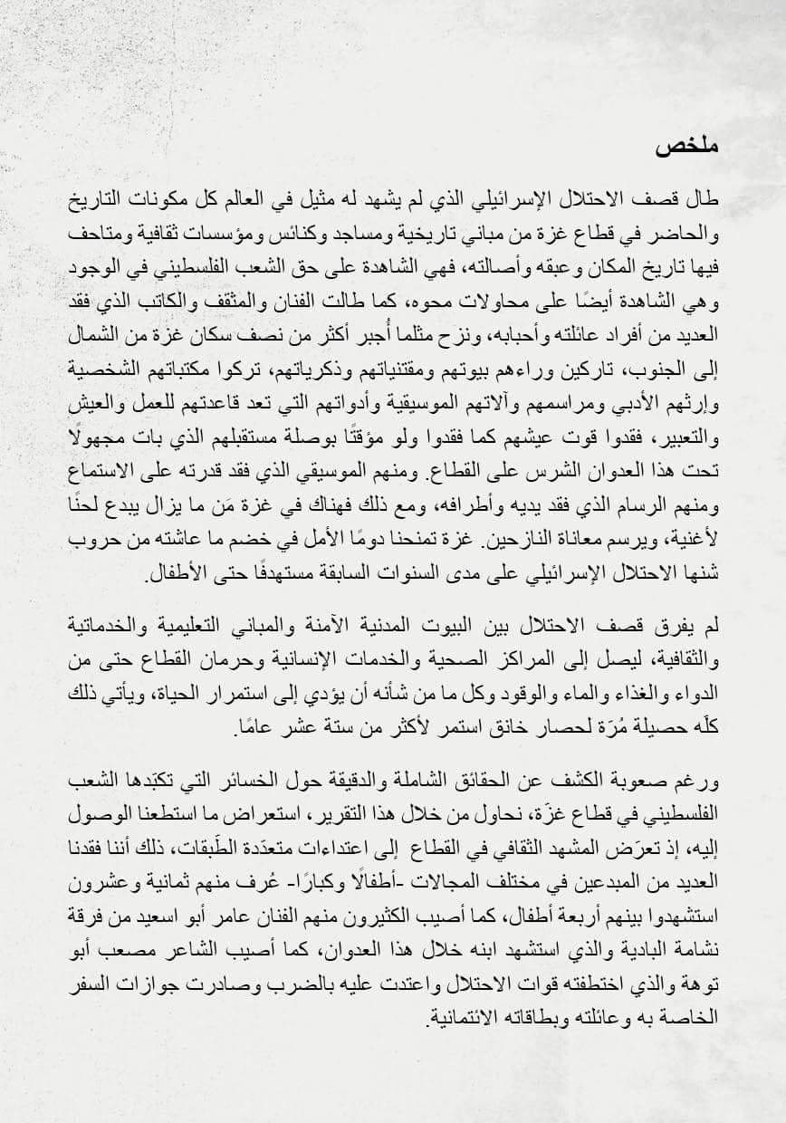هذا ويشمل التقرير نبذة عن حياة شهداء القطاع، وعن الاماكن المستهدفة من قبل طائرات الاحتلال وهي اماكن تاريخية ومسيحية واسلامية ومراكز ثقافية كان لها أثر كبير في المشهد الثقافي الفلسطيني في قطاع غزة.