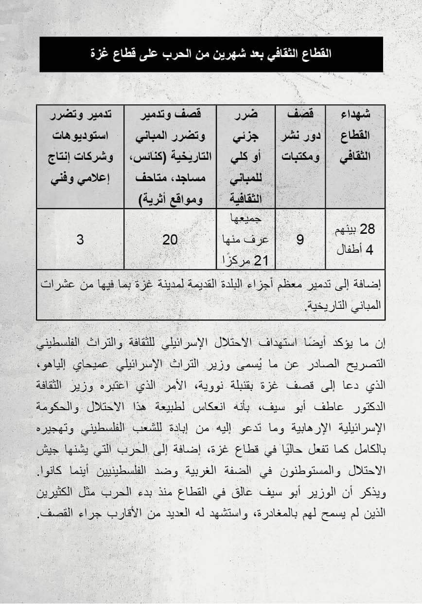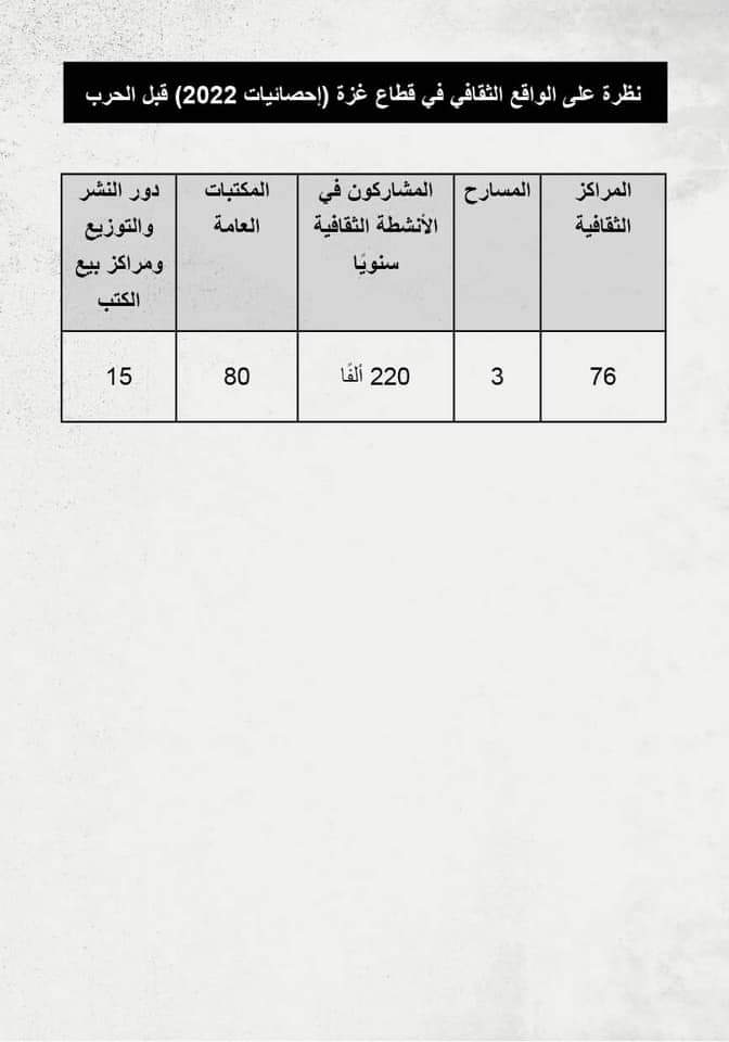 حيث فقد المشهد الثقافي العديد من المبدعين في مختلف المجالات عُرف منهم حتى اللحظة 28 استشهدوا من بينهم 4 أطفال، ودمرت تسعة دورِ نشر ومكتبات، بالإضافة إلى تضرر عدد من المراكز الثقافية بشكل كلي أو جزئي عرف منها 21 مركزاً، كما تعرضت معظم أجزاء البلدة القديمة لمدينة غزة للتدمير بما فيها 20 من المباني التاريخية، من كنائس، مساجد، متاحف ومواقع أثرية، وتدمير وتضرر 3 استوديوهات وشركات إنتاج إعلامي وفني.