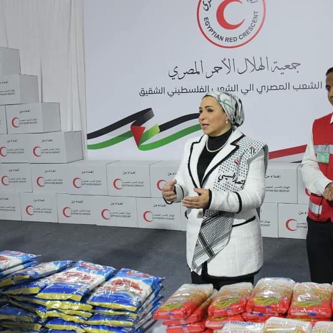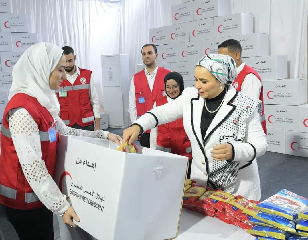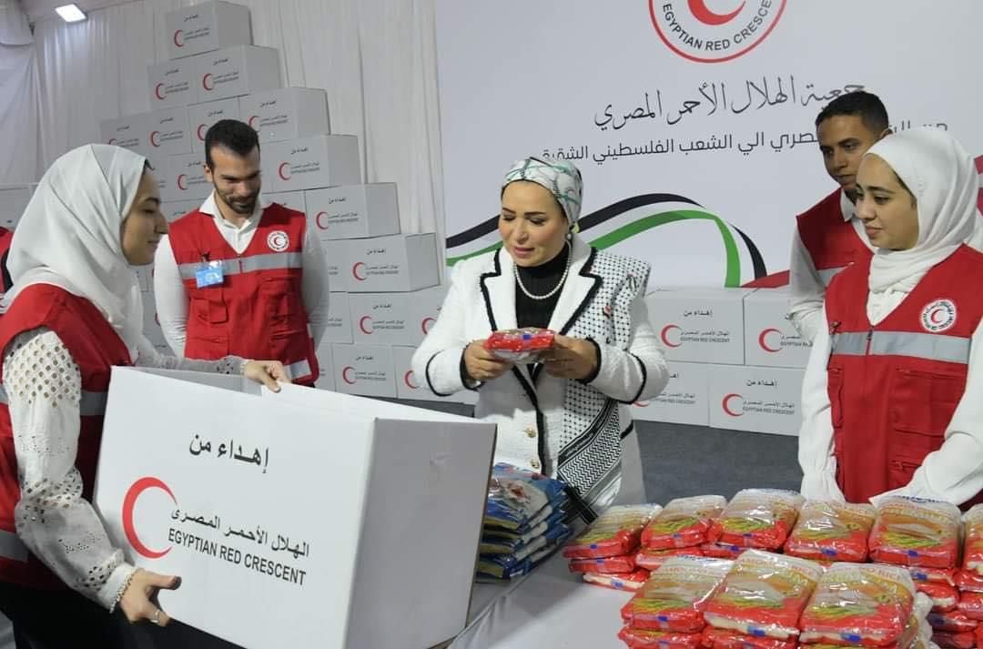 تفقدت السيدة انتصار السيسي - حرم الرئيس عبد الفتاح السيسي- جهود الهلال الأحمر المصري لدعم الأشقاء في غزة.
