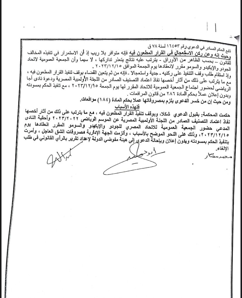 وجاء حكم المحكمة الذي صدر اليوم بقبول الدعوة شكلا وبوقف تنفيذ القرار المطعون فيه وما ما يترتب على ذلك من أثار أخصها نفاذ اعتماد التصنيف الصادر من اللجنة الأولمبية المصرية عن الموسم الرياضي 2022/2023 وبطلان القرار الصادر من وزارة الشباب والرياضة بإعتماد 32 هيئة فقط لها حق حضور الجمعية العمومية العادية.