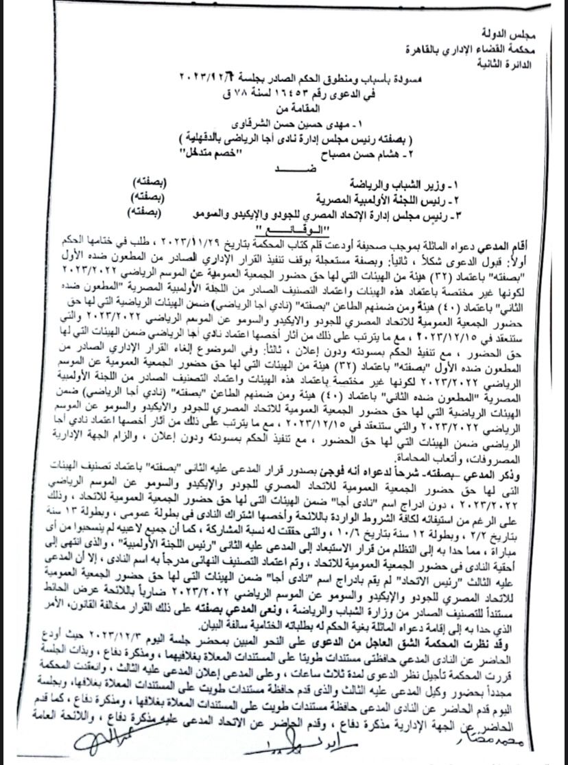 وأقام مهدي الشرقاوي رئيس نادي أجا الرياضي بالدقهلية وهشام مصباح عضو مجلس إدارة اتحاد الجودو كخصم متداخل الدعوى برقم 16453 لسنة 78 ق ضد كلا من وزير الشباب والرياضة ورئيس اللجنة الأولمبية المصرية ورئيس اتحاد الجودو المصري إعتراضا على اعتماد وجود 32 نادي في الجمعية العمومية للجودو وصدر الحكم اليوم في الدعوى.