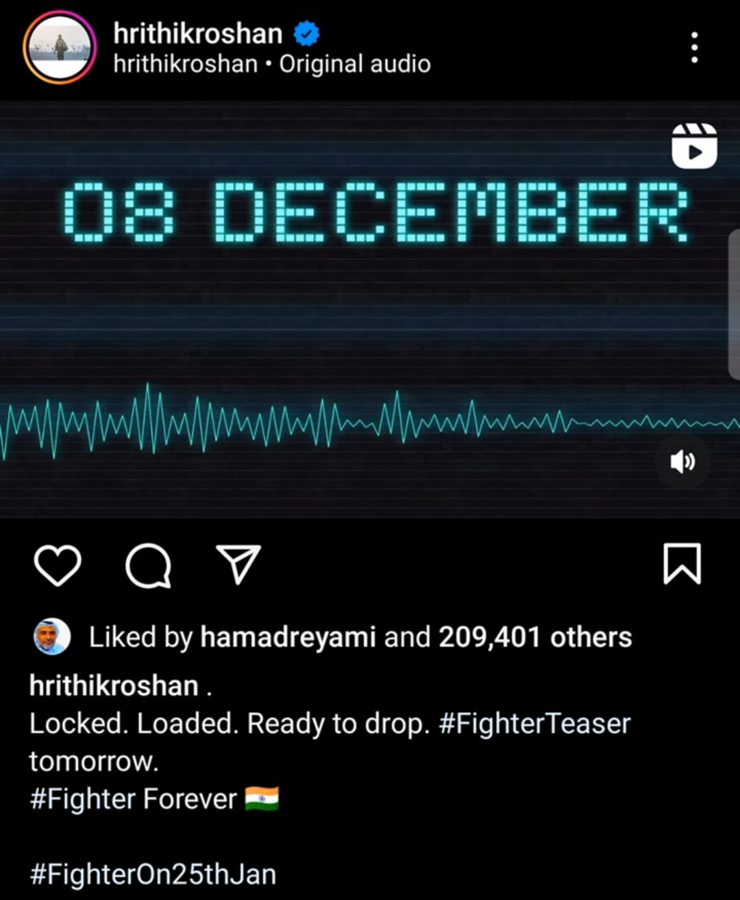نشر ريثيك روشان صورة على صفحته الرسمية عبر موقع تبادل الصور والفيديوهات " إنستجرام " وعلق قائلا " مغلق، محمل، جاهز للإسقاط، إعلان Fighter، غدا " .