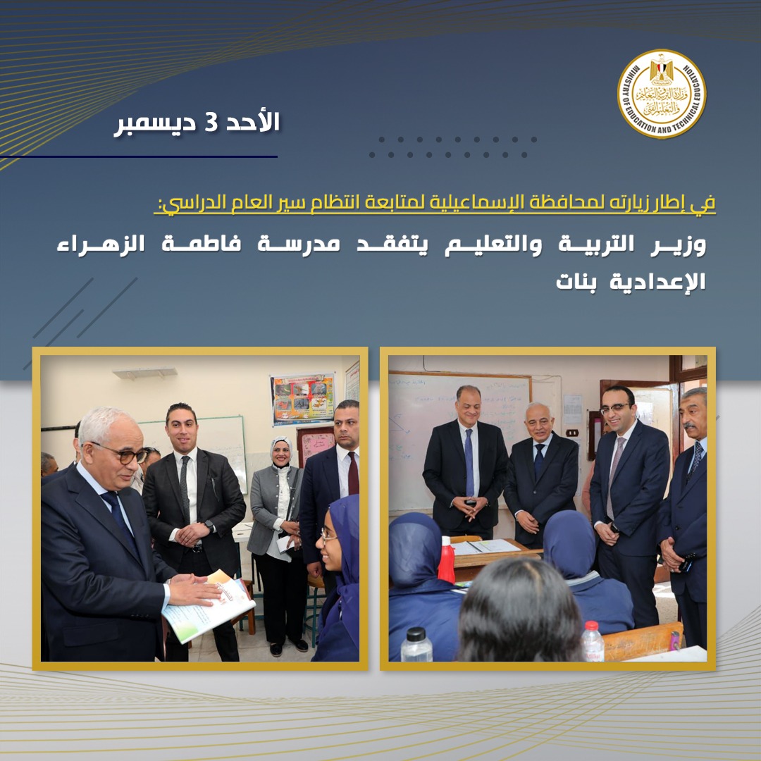 وقد تفقد الوزير سير الدراسة بفصول مدرسة فاطمة الزهراء الإعدادية للبنات، كما تفقد الوزير حجرة التربية الفنية وشاهد الوزير أعمال الطلاب الفنية حول الفن الشعبى الحديث ورسومات ولوحات فنية للطالبات على الكارتون، والخشب، والقماش، حيث أشاد الوزير بأعمال الطالبات الفنية، وحثهم على مواصلة واستمرار تنمية موهبتهم من خلال المشاركات فى المسابقات والأنشطة الفنية المختلفة التى تقوم بها الوزارة.