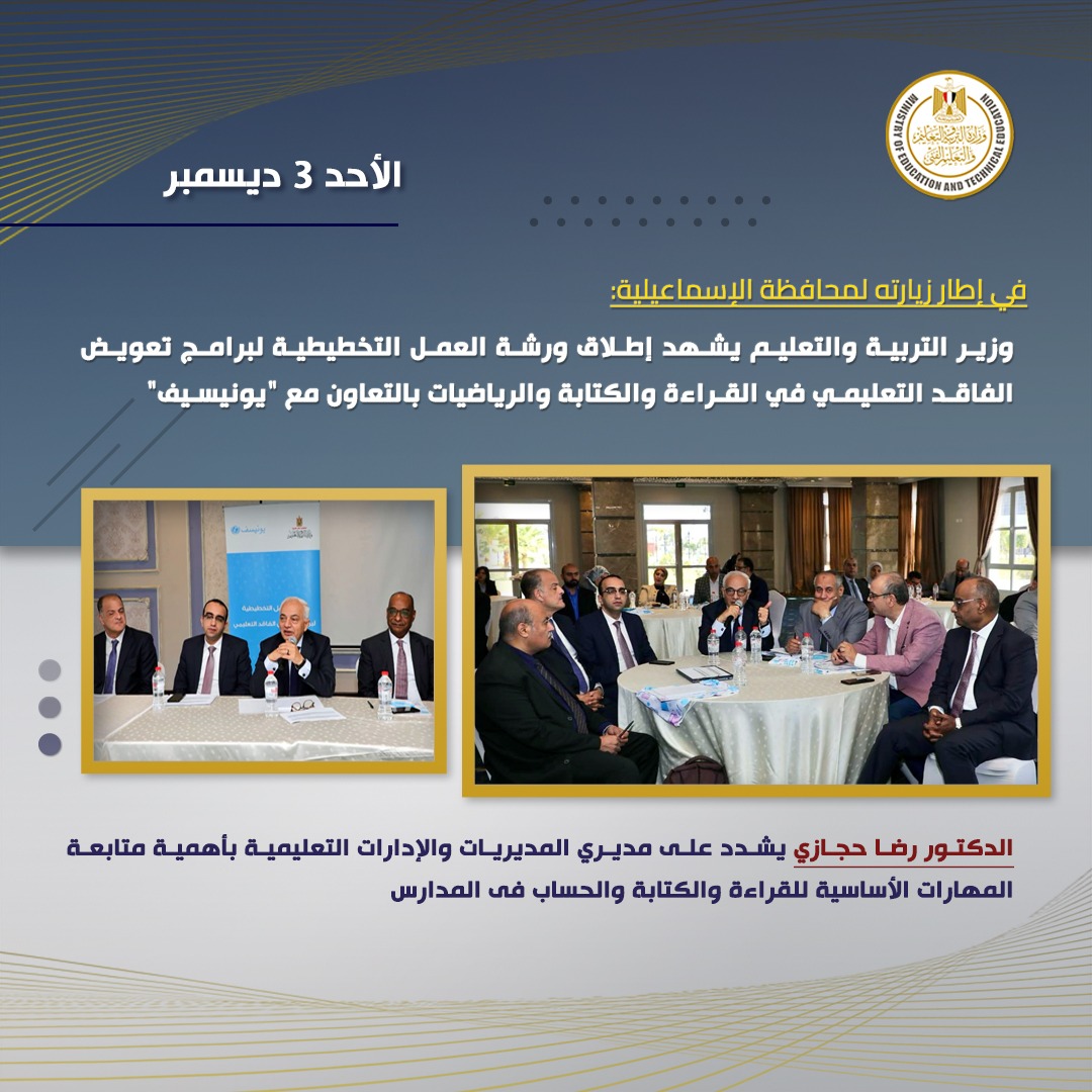 شهد الدكتور رضا حجازي وزير التربية والتعليم والتعليم الفني، إطلاق ورشة العمل التخطيطية لبرامج تعويض الفاقد التعليمي في المهارات الأساسية للقراءة والكتابة والحساب، بالتعاون مع منظمة يونيسيف، وذلك خلال الفترة من ٣ إلى ٥ ديسمبر ٢٠٢٣، بمحافظة الإسماعيلية.