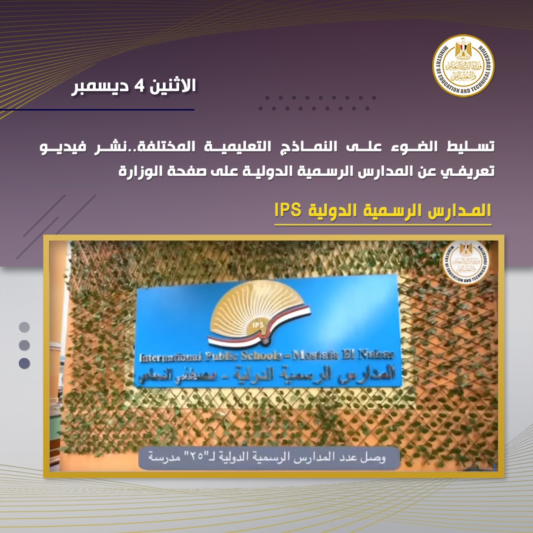 استمرارا لتسليط الضوء على النماذج التعليمية المختلفة، نشرت وزارة التربية والتعليم والتعليم الفني فيديو تعريفي عن مميزات ومناهج المدارس الرسمية الدولية على الصفحة الرسمية للوزارة.