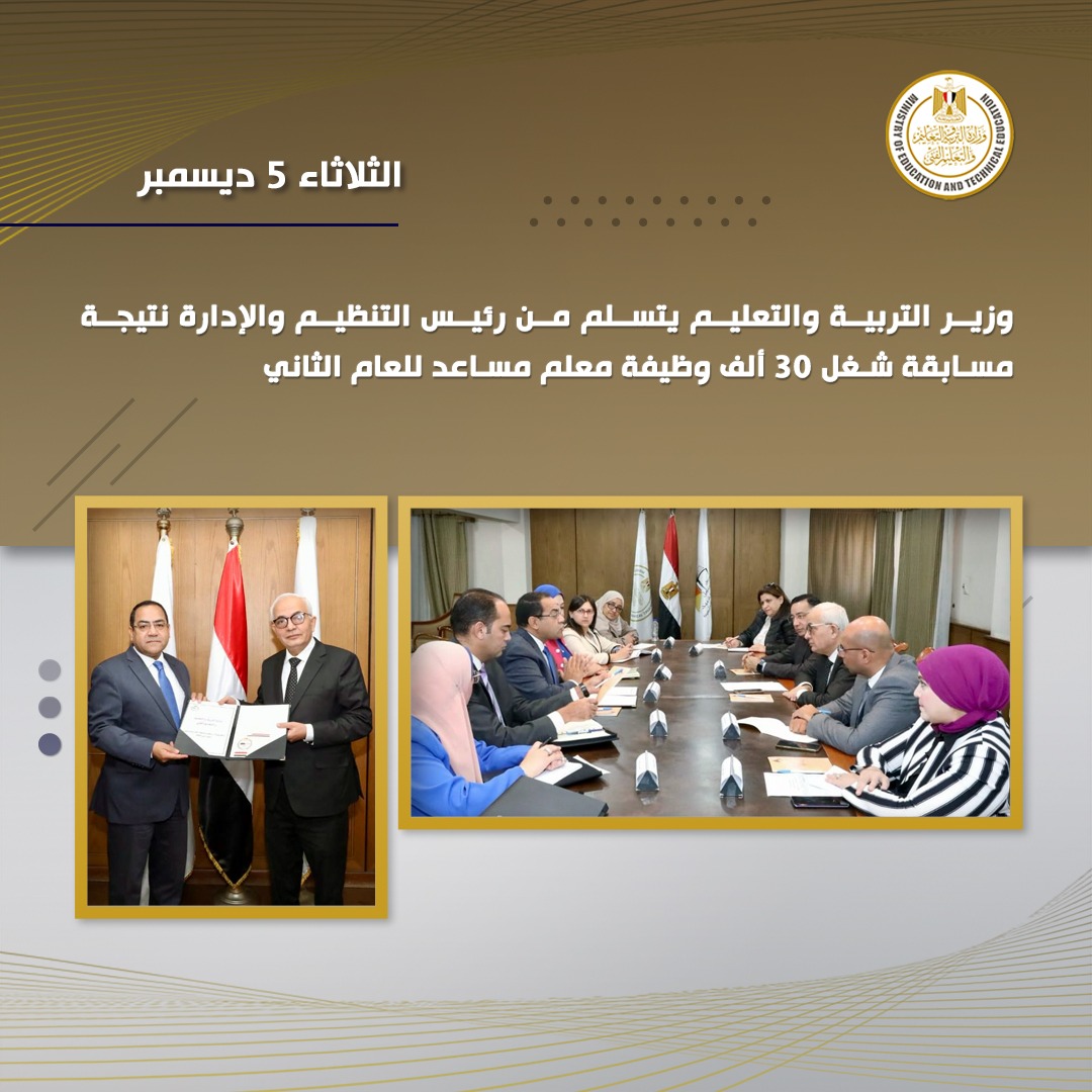 تسلم الدكتور رضا حجازي، وزير التربية والتعليم والتعليم والفني، من الدكتور صالح الشيخ، رئيس الجهاز المركزي للتنظيم والإدارة، نتيجة مسابقة شغل ٣٠ ألف وظيفة معلم مساعد للعام الثاني.