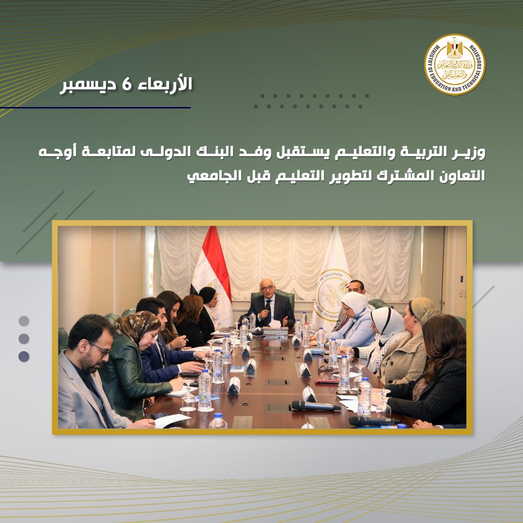 ومن جانبه، أكد وفد البنك الدولي مواصلة دعم وزارة التربية والتعليم والتعليم الفني في استكمال التطوير المستهدف، كما أشار الوفد إلى أهمية تعزيز التعاون لتحقيق نواتج ومهارات التعلم، ونظام الجودة الخاص برياض الاطفال والتقييم الوطني للصف الرابع الابتدائي والصف الاول الاعدادي ، والتنمية المهنية للمعلمين والموجهين والمديرين.