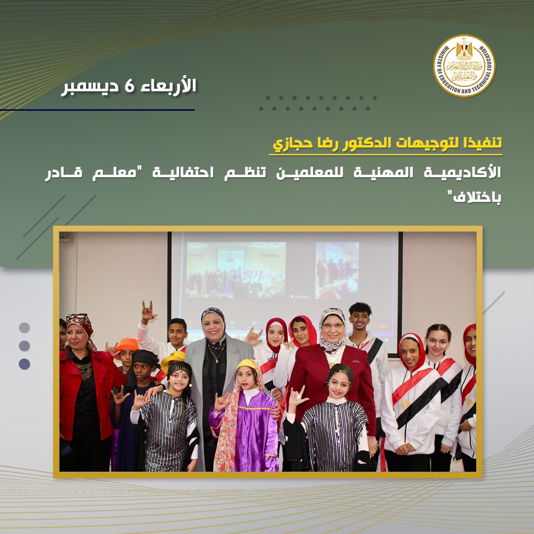 بتوجيهات الدكتور رضا حجازي وزير التربية والتعليم والتعليم الفني، نظمت الأكاديمية المهنية للمعلمين احتفالية "معلم قادر باختلاف"، وذلك تنفيذا لتوصيات السيد الرئيس عبدالفتاح السيسي من خلال مبادرة رفقاء "قادرون باختلاف".