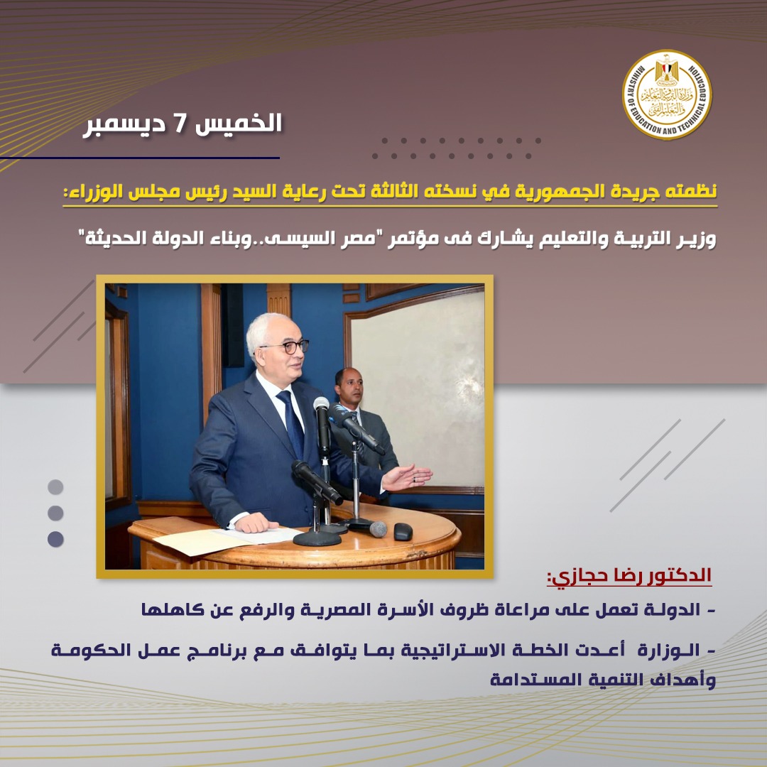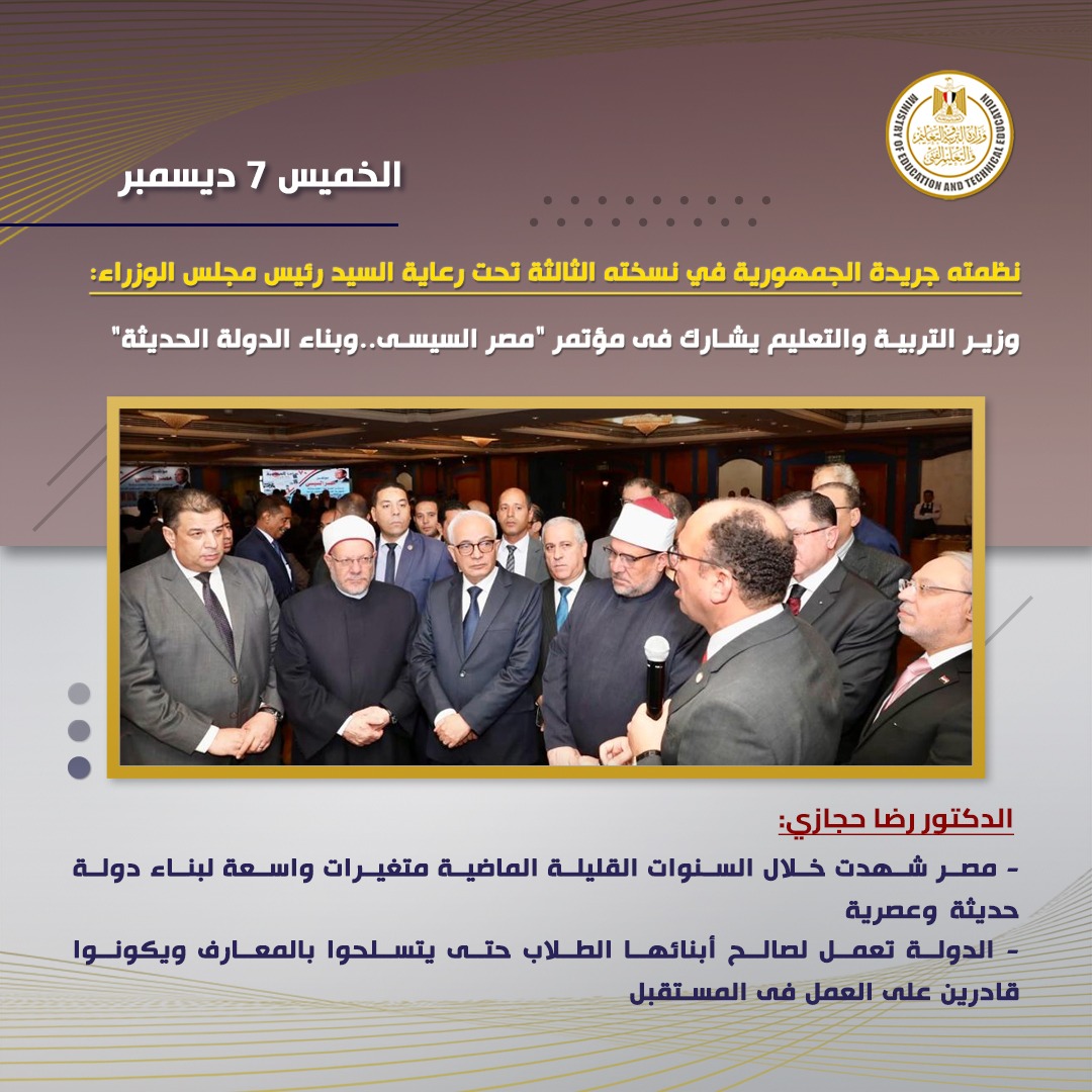 شارك الدكتور رضا حجازى وزير التربية والتعليم والتعليم الفنى اليوم فى مؤتمر "مصر السيسى..وبناء الدولة الحديثة" الذي نظمته جريدة الجمهورية فى نسخته الثالثة تحت رعاية الدكتور مصطفى مدبولى رئيس مجلس الوزراء.
