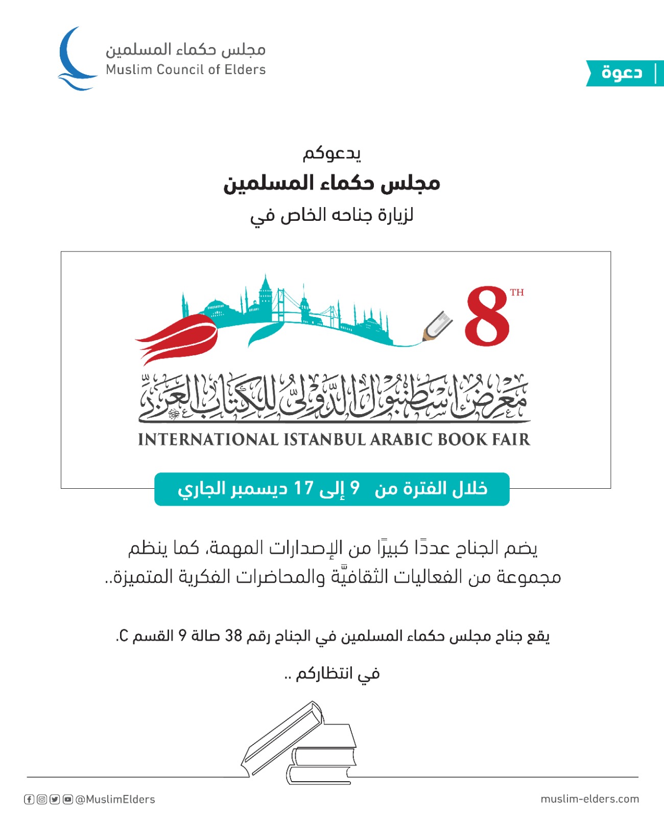 جدير بالذكر أن معرض إسطنبول الدّولي للكتاب العربي هو أكبر معرض دولي للكتاب العربي يُقام خارج الدول العربيّة، ويهدف إلى إحياء اللغة العربية في تركيا، وتوفير العديد من الإصدارات في مختلف المجالات للمهتمين باللّغة العربية وعلومها، كما يُشكل المعرض أيضًا، الذي ينعقد هذا العام تحت شعار "العربية تجمعنا"، حدثًا مهمًّا تقصِدُهُ الجاليات العربية في أوروبا، باعتبار مدينة إسطنبول جسر التواصل بين الشرق والغرب، ويقع جناح مجلس حكماء المسلمين في الجناح رقم 38 صالة رقم 9 القسم C.