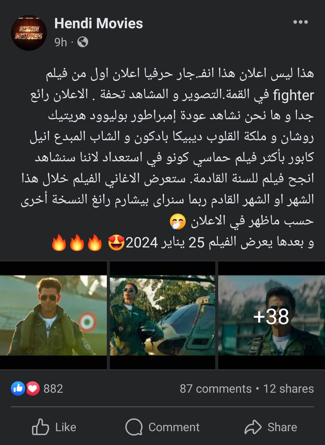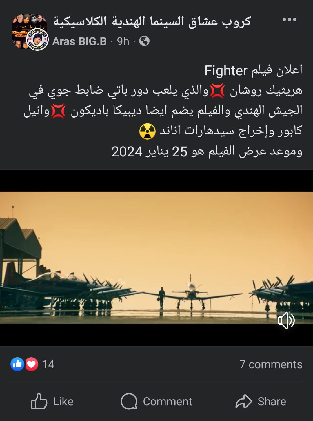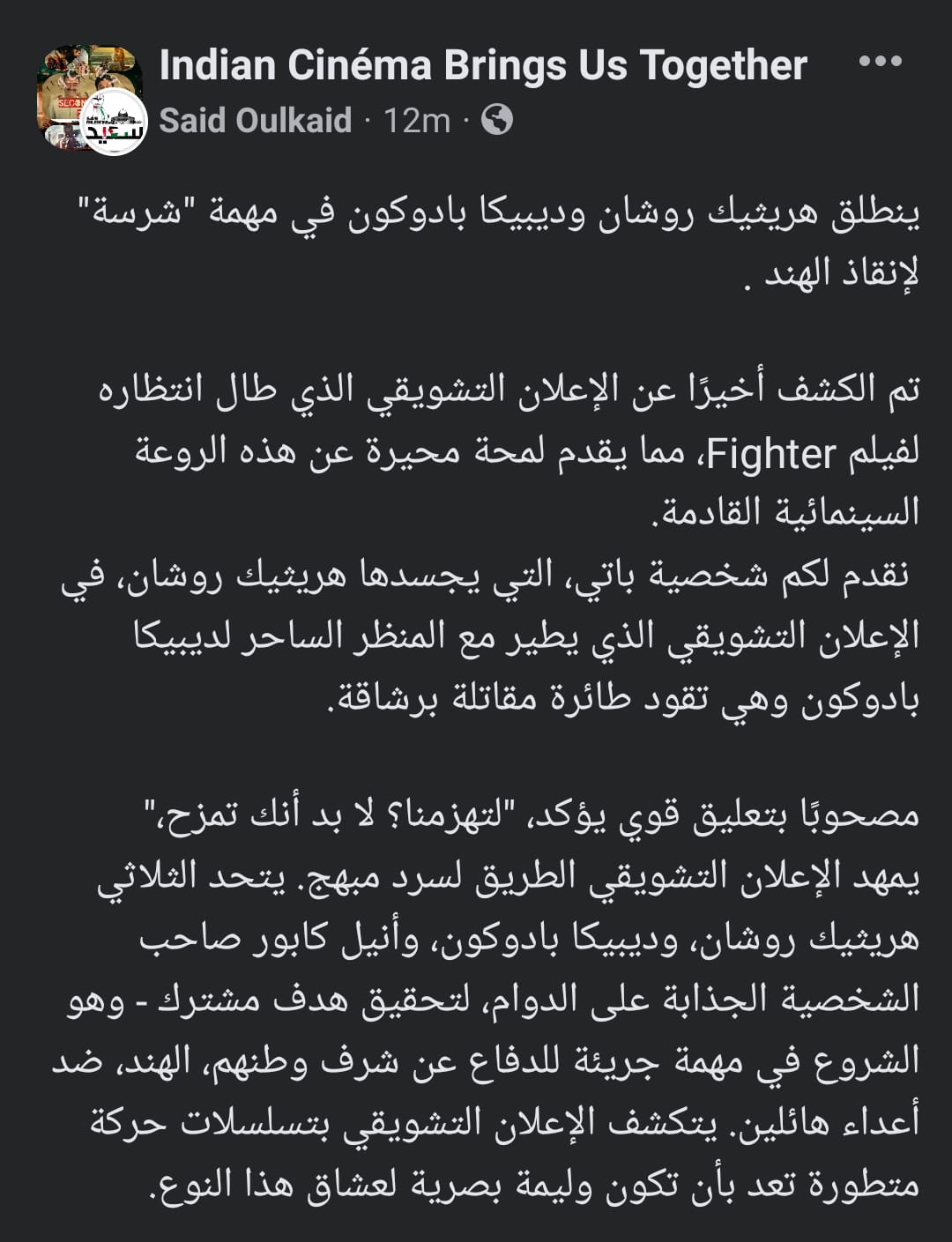 طرح النجم الهندي ريثيك روشان، الإعلان الرسمي لفيلمه الجديد "Fighter"، والذي من المقرر طرحه في دور العرض الهندية في 25 يناير المقبل.