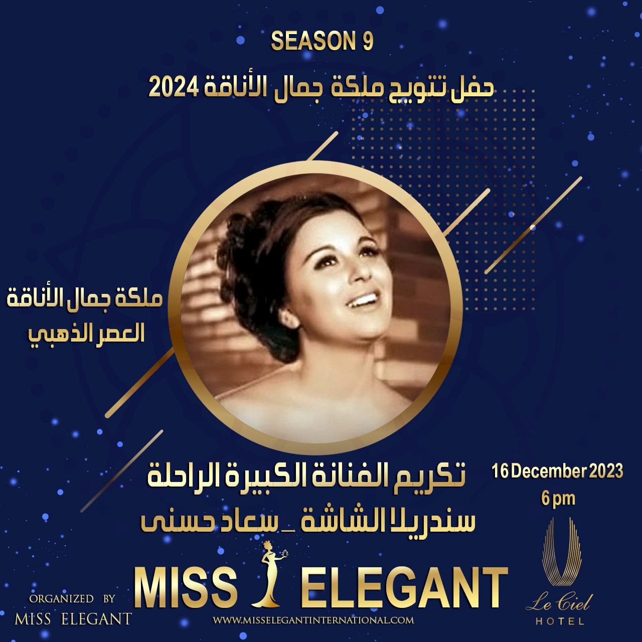 تنطلق فعاليات حفل مسابقة Miss elegant "ملكة جمال الأناقة" في دورتها التاسعة ومن المقرر إقامتها في يوم 16 ديسمبر الجاري، في فندق لوسيال، للإعلان عن الإسم الفائز باللقب لعام 2024.