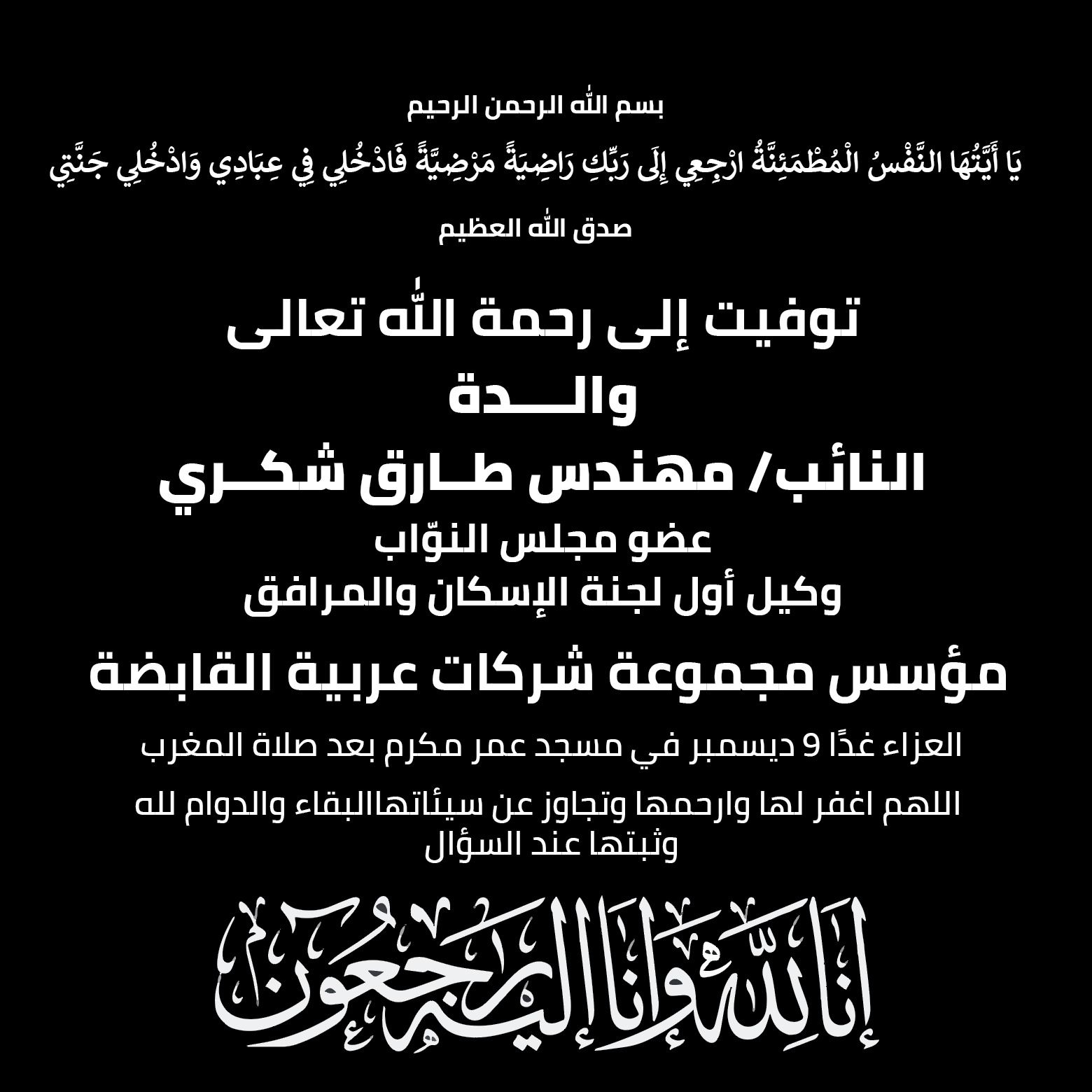 نعي المهندس عمرو دياب، نائب رئيس مجموعة عربية للتنمية، نيابة عن مجموعة عربية للتنمية ، بخالص العزاء النائب المهندس طارق شكري عضو مجلس النواب ووكيل اول لجنة الإسكان ومؤسس مجموعة شركات عربية القابضة في وفاة السيدة والدته والتي وفاتها المنية اليوم.