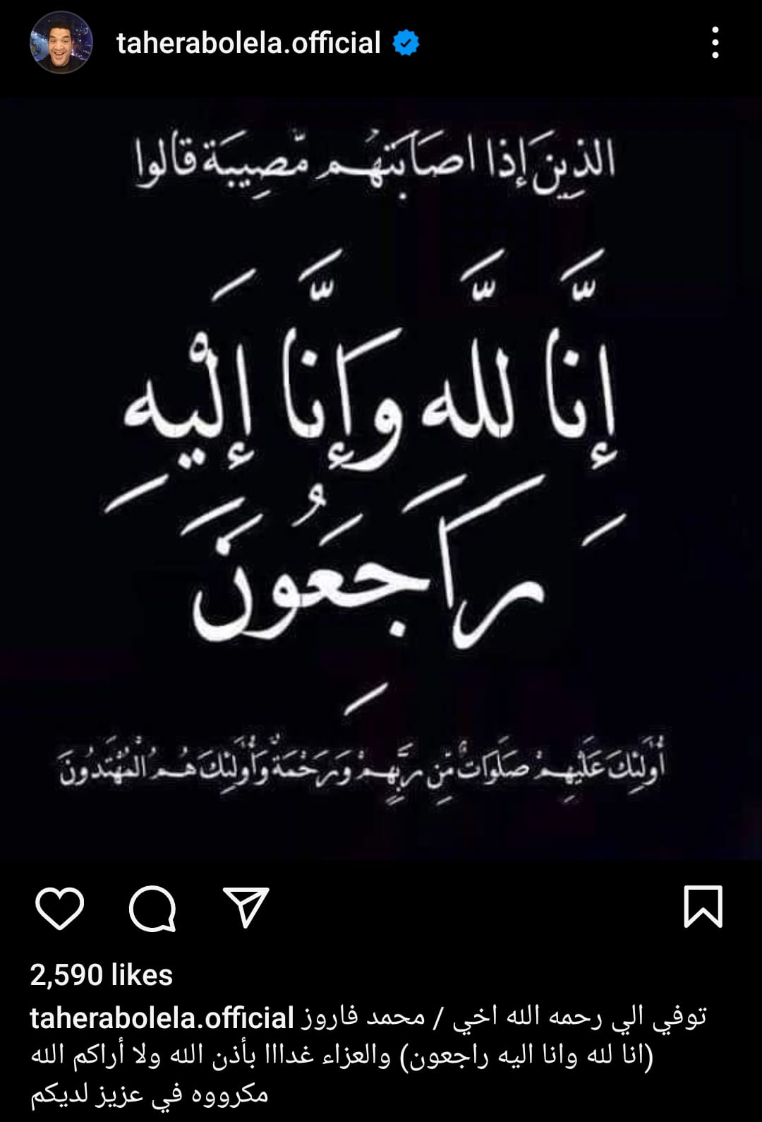 وعلق طاهر أبو ليلة قائلا " توفي إلى رحمة الله أخي محمد فاروق .. إنا لله وإنا إليه راجعون .. والعزاء غدا بإذن الله ولا أراكم الله مكروه في عزيز لديكم " .