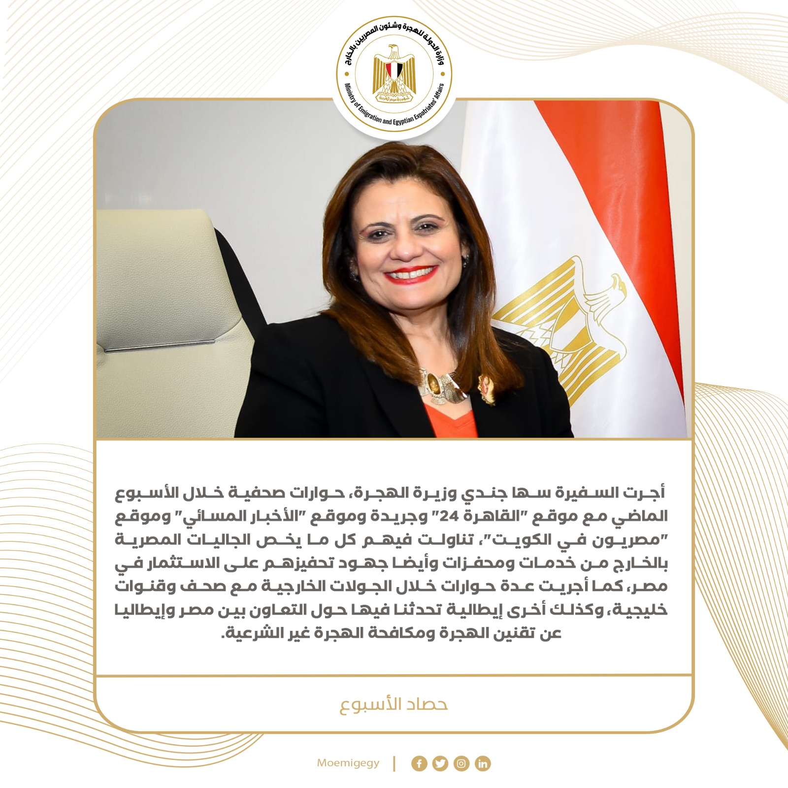 وأجرت السفيرة سها جندي وزيرة الهجرة، حوارات صحفية خلال الأسبوع الماضي تناولت فيهم كل ما يخص الجاليات المصرية بالخارج من خدمات ومحفزات وأيضا جهود تحفيزهم على الاستثمار في مصر، كما أجريت عدة حوارات خلال الجولات الخارجية مع صحف وقنوات خليجية، وكذلك أخرى إيطالية تحدثنا فيها حول التعاون بين مصر وإيطاليا عن تقنين الهجرة ومكافحة الهجرة غير الشرعية.