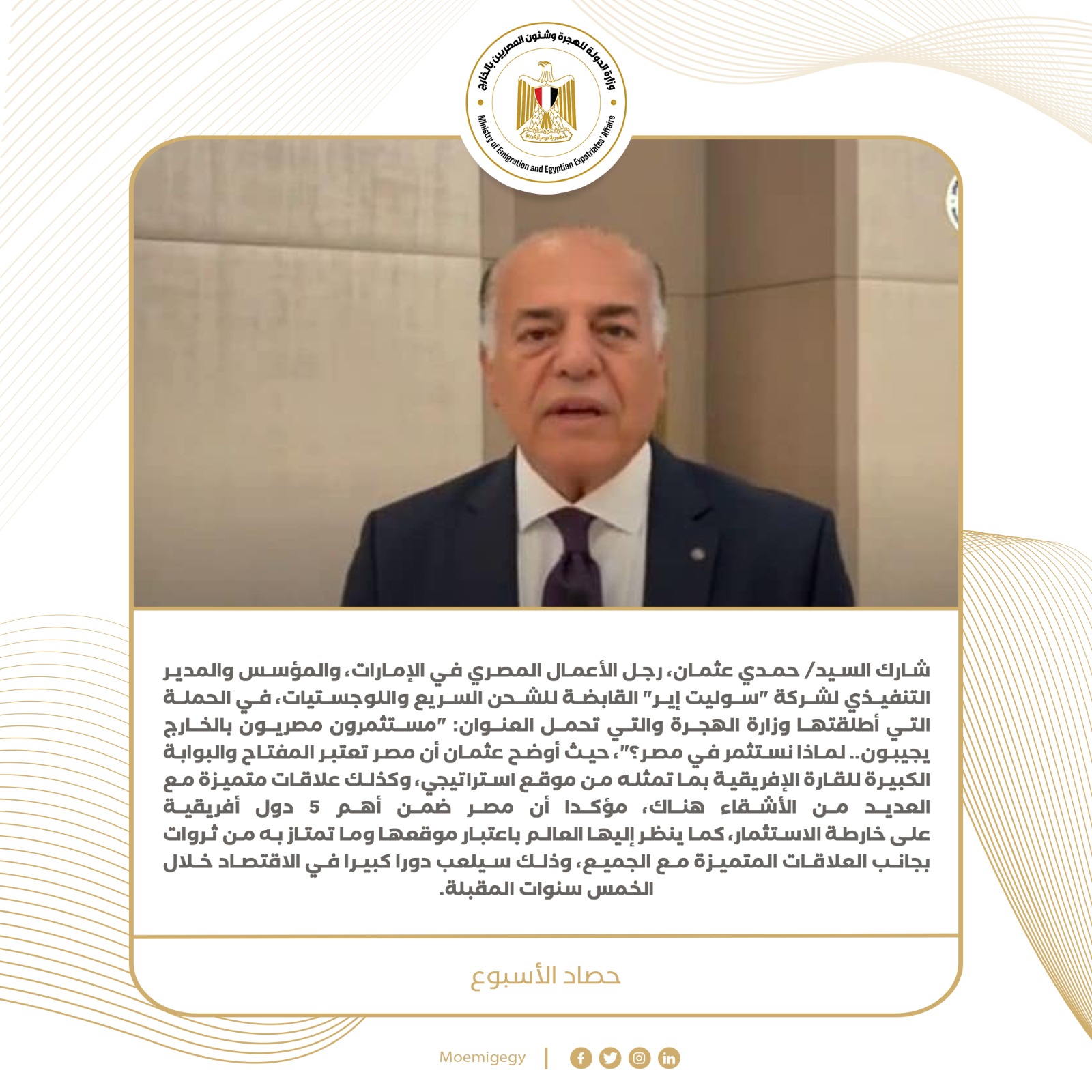 و شارك حمدي عثمان، رجل الأعمال المصري في الإمارات، والمؤسس والمدير التنفيذي لشركة "سوليت إير" القابضة للشحن السريع واللوجستيات، في الحملة التي أطلقتها وزارة الهجرة والتي تحمل العنوان: "مستثمرون مصريون بالخارج يجيبون.. لماذا نستثمر في مصر؟"، حيث أوضح عثمان أن مصر تعتبر المفتاح والبوابة الكبيرة للقارة الإفريقية بما تمثله من موقع استراتيجي، وكذلك علاقات متميزة مع العديد من الأشقاء هناك، مؤكدا أن مصر ضمن أهم 5 دول أفريقية على خارطة الاستثمار، كما ينظر إليها العالم باعتبار موقعها وما تمتاز به من ثروات بجانب العلاقات المتميزة مع الجميع، وذلك سيلعب دورا كبيرا في الاقتصاد خلال الخمس سنوات المقبلة.