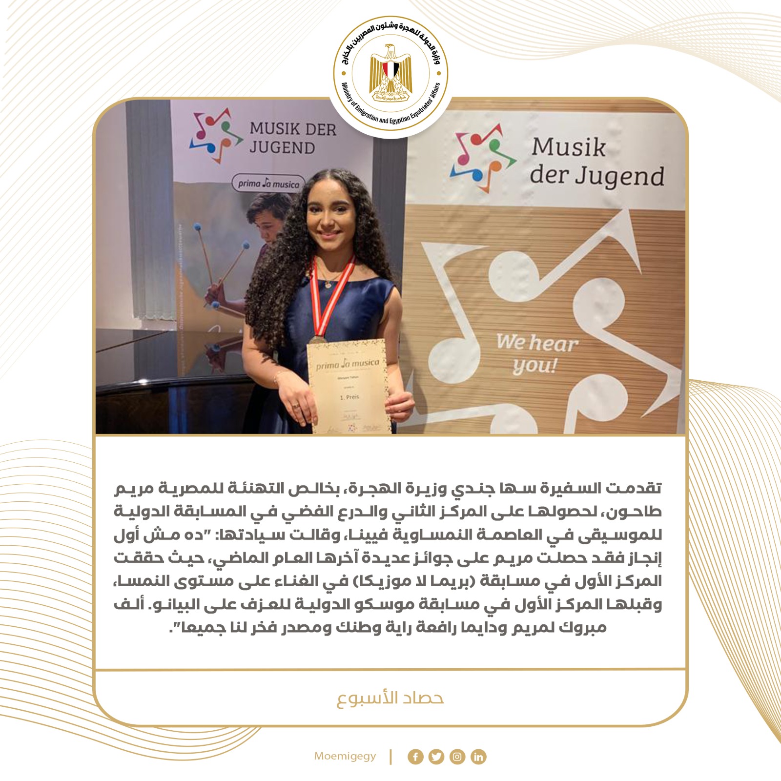 وتقدمت السفيرة سها جندي وزيرة الهجرة، بخالص التهنئة للمصرية مريم طاحون، لحصولها على المركز الثاني والدرع الفضي في المسابقة الدولية للموسيقى في العاصمة النمساوية فيينا، وقالت سيادتها: "ده مش أول إنجاز فقد حصلت مريم على جوائز عديدة آخرها العام الماضي، حيث حققت المركز الأول في مسابقة (بريما لا موزيكا) في الغناء على مستوى النمسا، وقبلها المركز الأول في مسابقة موسكو الدولية للعزف على البيانو. ألف مبروك لمريم ودايما رافعة راية وطنك ومصدر فخر لنا جميعًا".