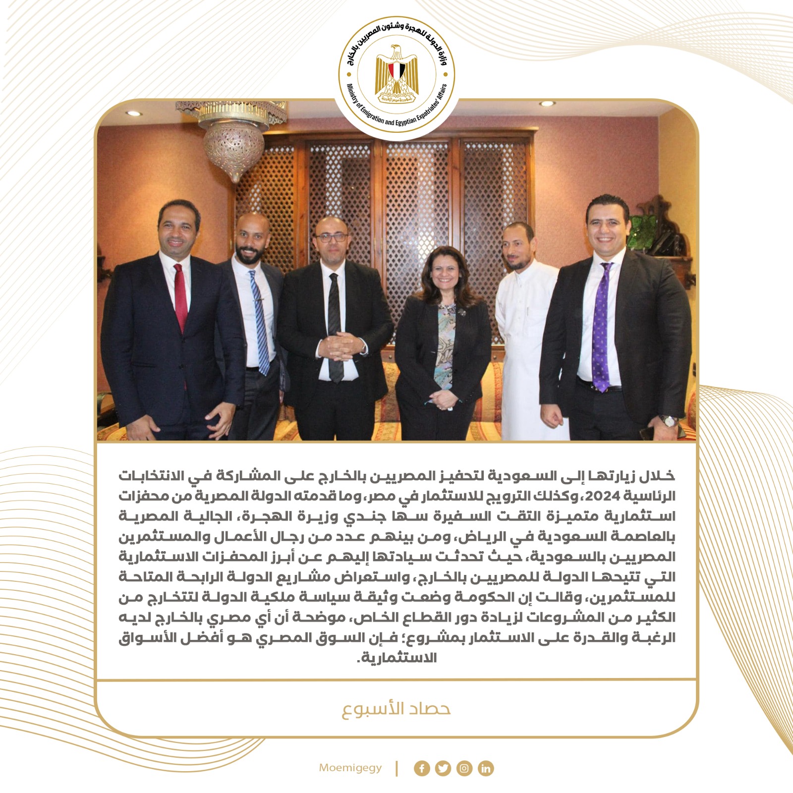 خلال زيارة السفيرة سها جندي وزيرة الهجرة، الجالية المصرية إلى السعودية لتحفيز المصريين بالخارج على المشاركة في الانتخابات الرئاسية 2024، وكذلك الترويج للاستثمار في مصر، وما قدمته الدولة المصرية من محفزات استثمارية متميزة التقت السفيرةعدد من الجاليات المصرية بالعاصمة السعودية الرياض، ومن بينهم عدد من رجال الأعمال والمستثمرين المصريين بالسعودية، حيث تحدثت إليهم عن أبرز المحفزات الاستثمارية التي تتيحها الدولة للمصريين بالخارج، واستعراض مشاريع الدولة الرابحة المتاحة للمستثمرين، وقالت إن الحكومة وضعت وثيقة سياسة ملكية الدولة لتتخارج من الكثير من المشروعات لزيادة دور القطاع الخاص، موضحة أن أي مصري بالخارج لديه الرغبة والقدرة على الاستثمار بمشروع؛ فإن السوق المصري هو أفضل الأسواق الاستثمارية.
