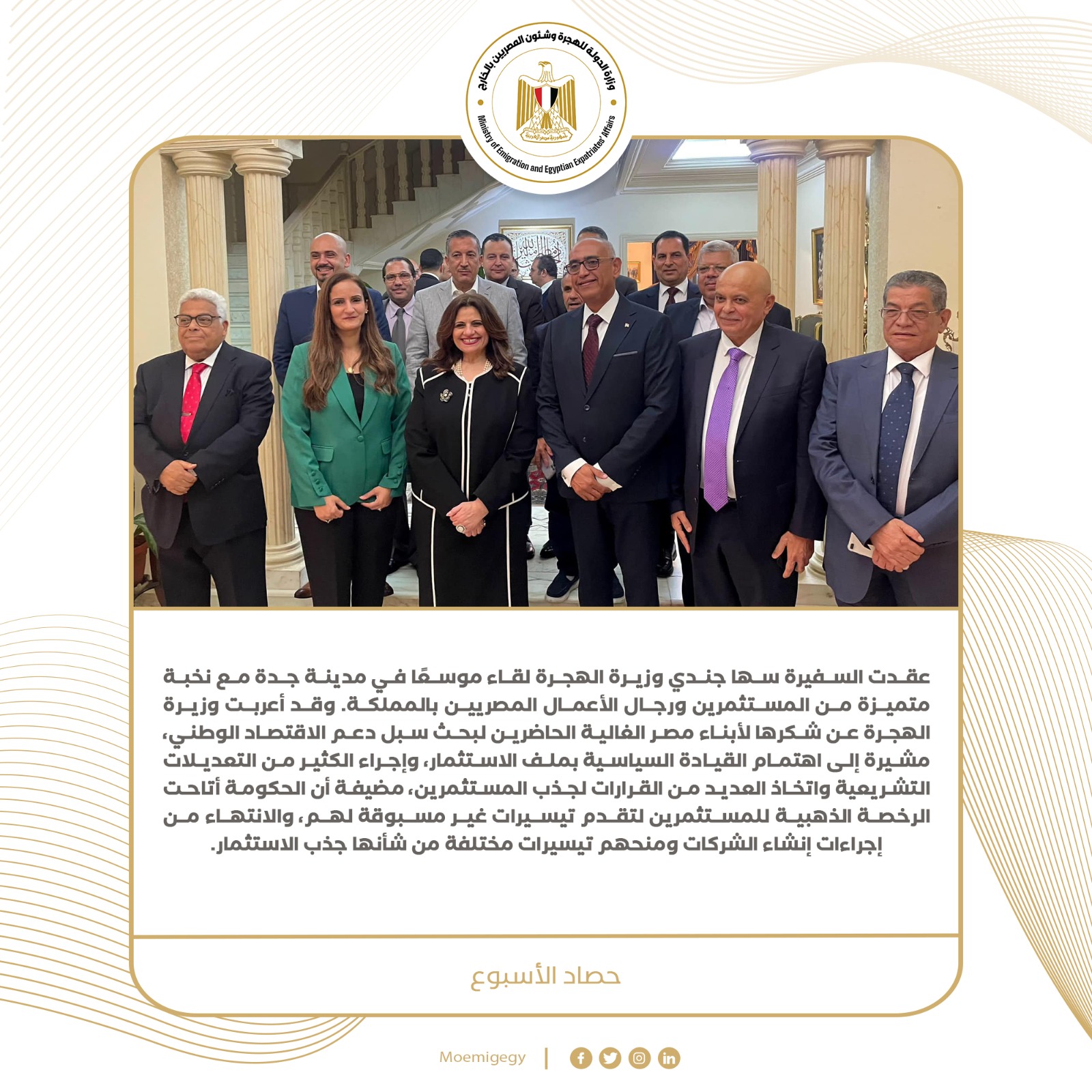 عقدت السفيرة سها جندي وزيرة الهجرة لقاء موسعًا في مدينة جدة مع نخبة متميزة من المستثمرين ورجال الأعمال المصريين بالمملكة. وقد أعربت وزيرة الهجرة عن شكرها لأبناء مصر الغالية الحاضرين لبحث سبل دعم الاقتصاد الوطني، مشيرة إلى اهتمام القيادة السياسية بملف الاستثمار، وإجراء الكثير من التعديلات التشريعية واتخاذ العديد من القرارات لجذب المستثمرين، مضيفة أن الحكومة أتاحت الرخصة الذهبية للمستثمرين لتقدم تيسيرات غير مسبوقة لهم، والانتهاء من إجراءات إنشاء الشركات ومنحهم تيسيرات مختلفة من شأنها جذب الاستثمار.