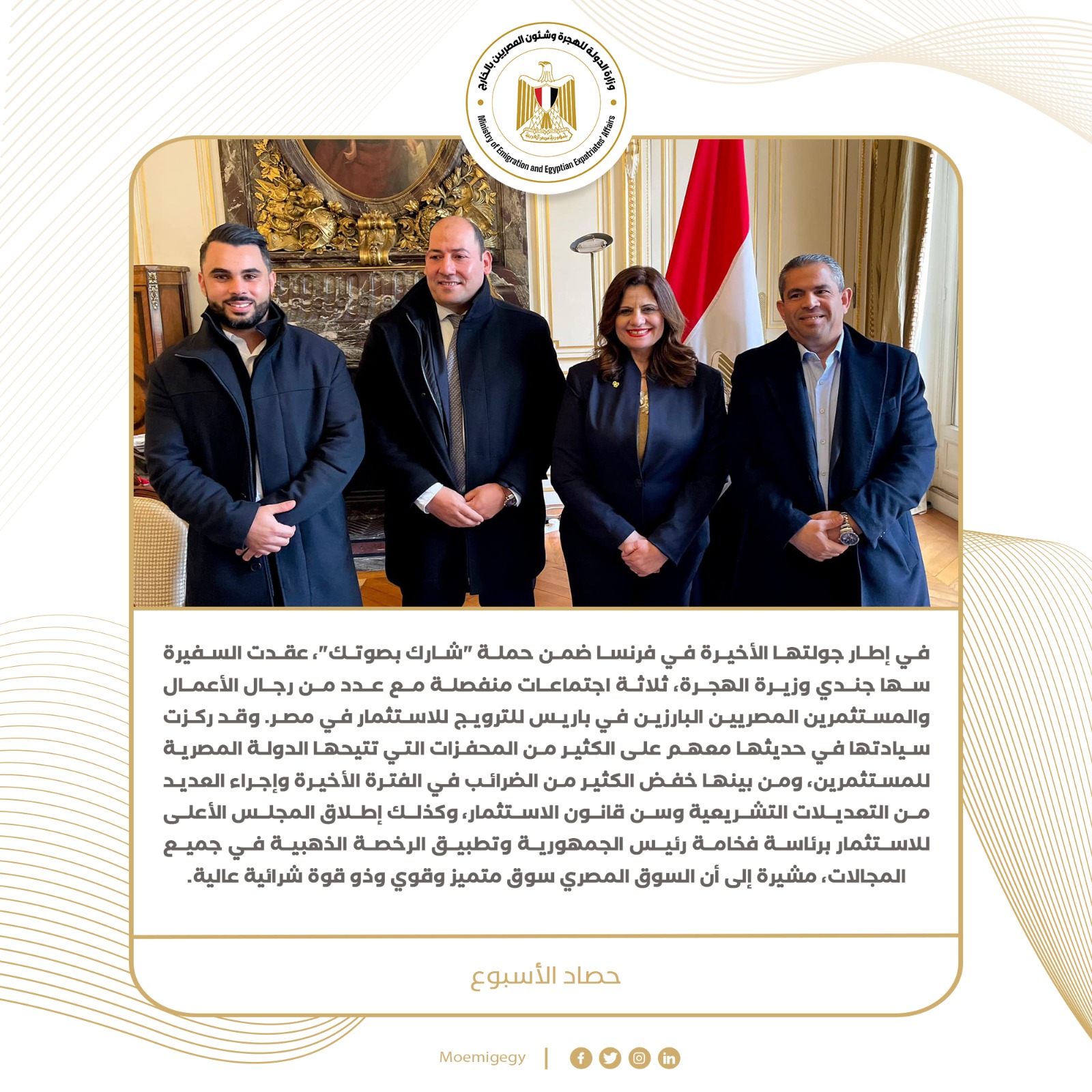 في إطار جولتها الأخيرة في فرنسا ضمن حملة "شارك بصوتك"، عقدت السفيرة سها جندي وزيرة الهجرة، ثلاثة اجتماعات منفصلة مع عدد من رجال الأعمال والمستثمرين المصريين البارزين في باريس للترويج للاستثمار في مصر. وقد ركزت سيادتها في حديثها معهم على الكثير من المحفزات التي تتيحها الدولة المصرية للمستثمرين، ومن بينها خفض الكثير من الضرائب في الفترة الأخيرة وإجراء العديد من التعديلات التشريعية وسن قانون الاستثمار، وكذلك إطلاق المجلس الأعلى للاستثمار برئاسة فخامة رئيس الجمهورية وتطبيق الرخصة الذهبية في جميع المجالات، مشيرة إلى أن السوق المصري سوق متميز وقوي وذو قوة شرائية عالية.