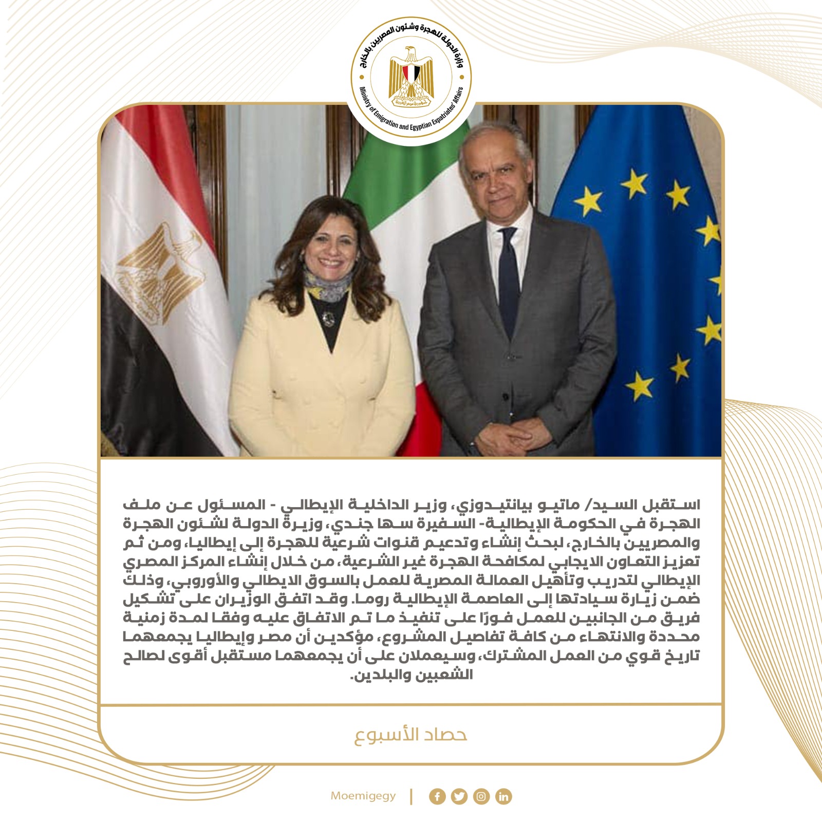 واستقبل السيد/ ماتيو بيانتيدوزي، وزير الداخلية الإيطالي - المسئول عن ملف الهجرة في الحكومة الإيطالية- السفيرة سها جندي، وزيرة الدولة لشئون الهجرة والمصريين بالخارج، لبحث إنشاء وتدعيم قنوات شرعية للهجرة إلى إيطاليا، ومن ثم تعزيز التعاون الايجابي لمكافحة الهجرة غير الشرعية، من خلال إنشاء المركز المصري الإيطالي لتدريب وتأهيل العمالة المصرية للعمل بالسوق الايطالي والأوروبي، وذلك ضمن زيارة سيادتها إلى العاصمة الإيطالية روما. وقد اتفق الوزيران على تشكيل فريق من الجانبين للعمل فورًا على تنفيذ ما تم الاتفاق عليه وفقا لمدة زمنية محددة والانتهاء من كافة تفاصيل المشروع، مؤكدين أن مصر وإيطاليا يجمعهما تاريخ قوي من العمل المشترك، وسيعملان على أن يجمعهما مستقبل أقوى لصالح الشعبين والبلدين.